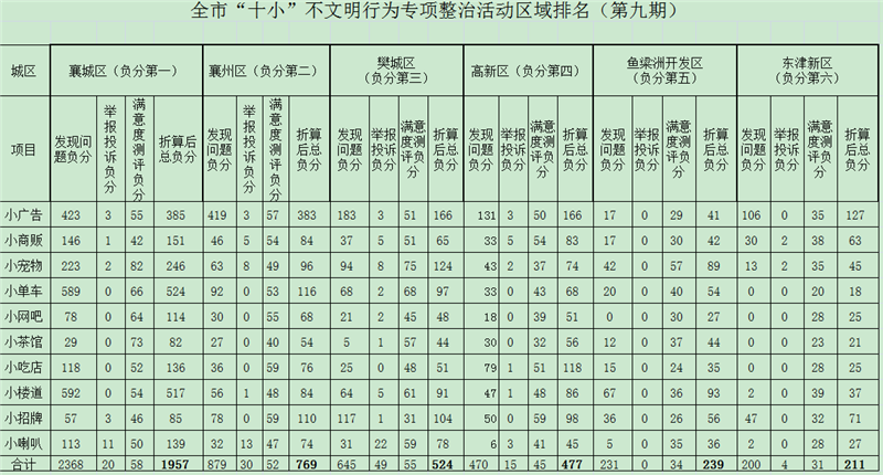 此次全市“十小”不文明行为专项整治活动区域排名中,襄城区因发现问题数、投诉率、满意度总评分再次垫底,总负分达1957分。第二期、第三期位居两期负分榜首的襄州区此次排名倒数第二,总负分769分,比上一期多了438分。第五期总负分排名第一的高新区此次排名第四,鱼梁洲开发区以总负分239分排名第五,东津新区在总负分排名中仍居第六。