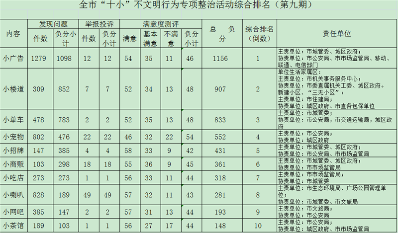 10月24日,市创文办公布第九期全市“十小”不文明行为专项整治活动区域排名和全市“十小”不文明行为专项整治活动综合排名。记者发现,与前八期排名相比,“小广告”反弹严重,以总负分1156分名列综合排名榜首;襄城区以总负分排名第一,在区域排名中垫底。