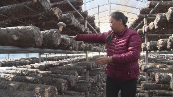 自从村里这个食用菌基地建成后,村民李仁菊就和姐妹们到基地上采摘香菇,既增加了收入,又照顾了家庭。“种完田,农闲时还可以到基地打工,一天能挣五、六十元。这对我们来说非常好。”李仁菊就兴地说。