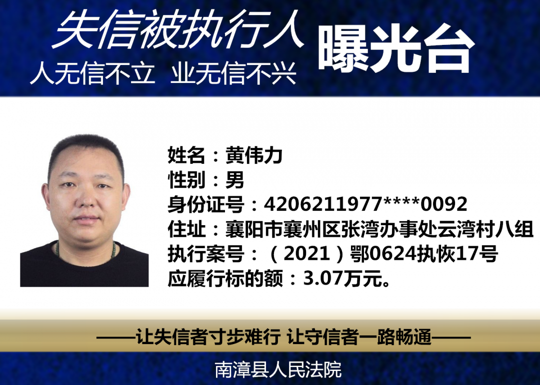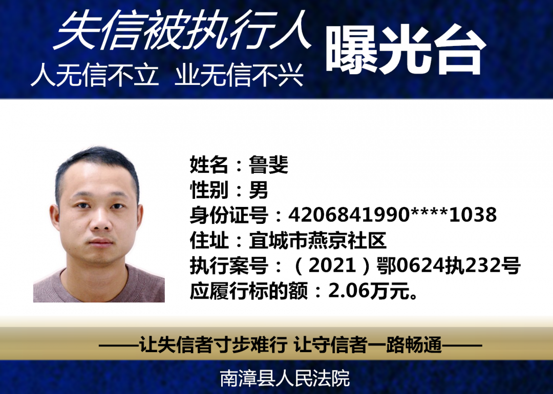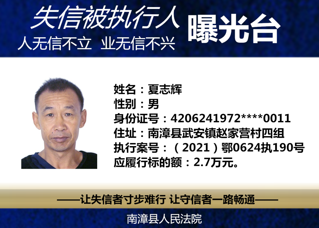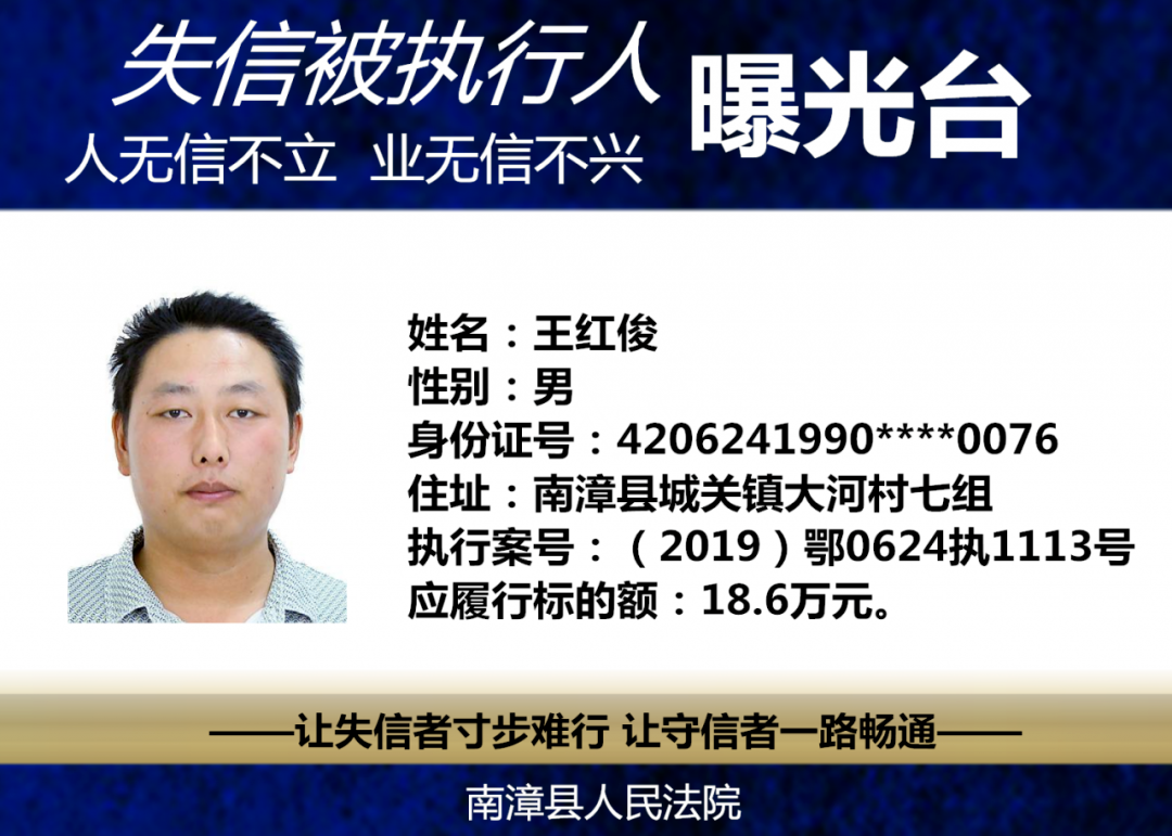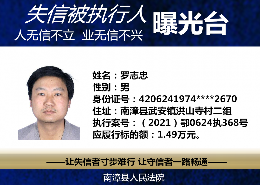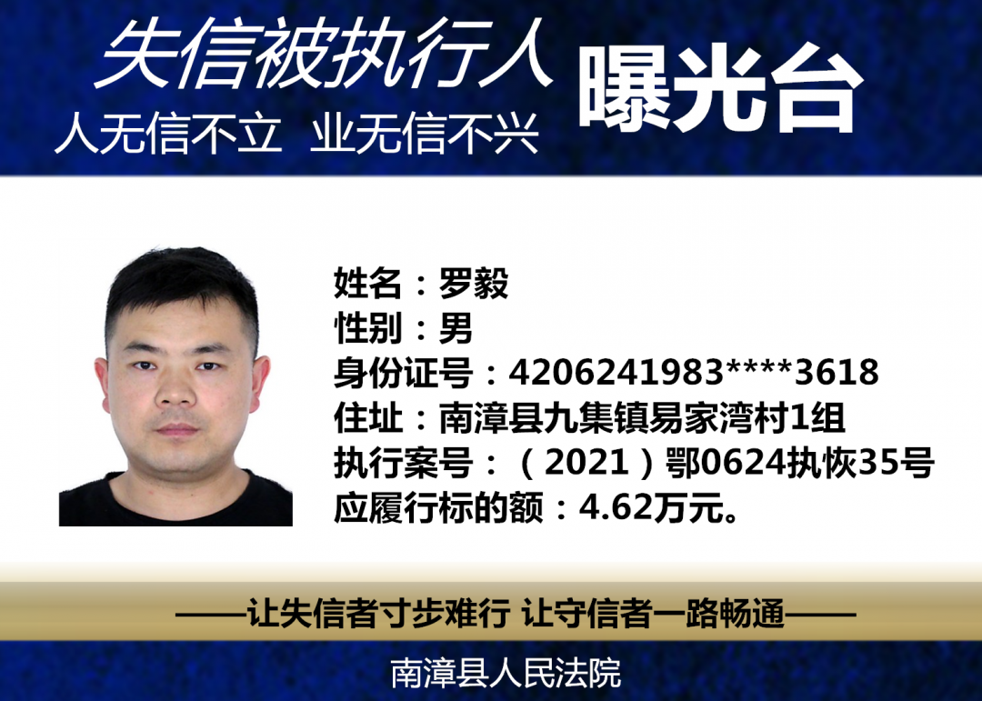 为维护法律的尊严与权威,督促被执行人履行生效法律文书确定的义务,弘扬诚实守信的社会风气,推进诚信社会建设,南漳县人民法院根据《中华人民共和国民事诉讼法》及相关法律规定,决定对下列失信被执行人予以曝光。同时也欢迎广大市民提供失信被执行人的财产线索。☏ 举报热线 0710-5238394