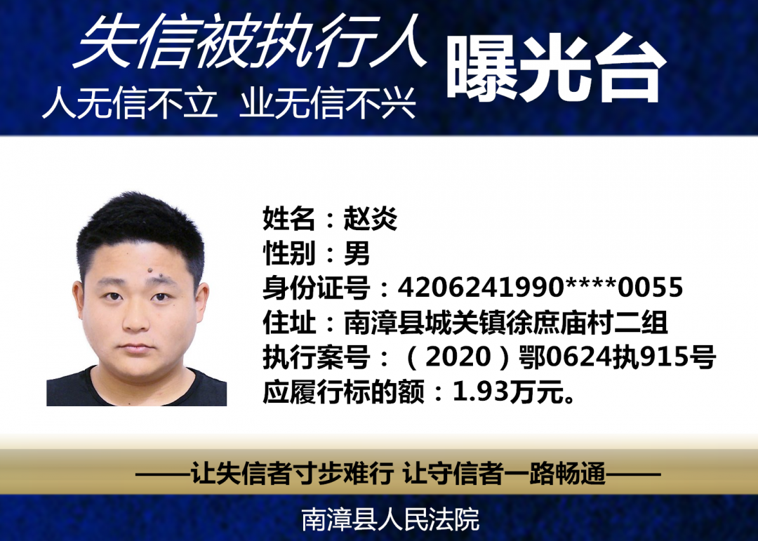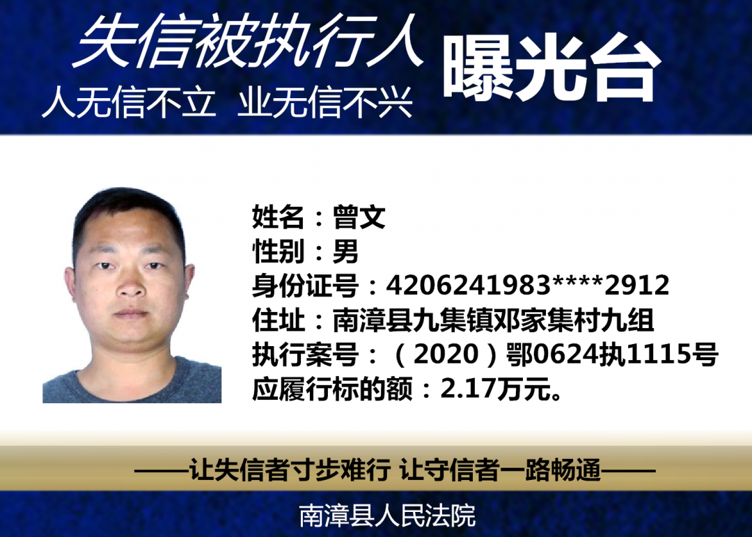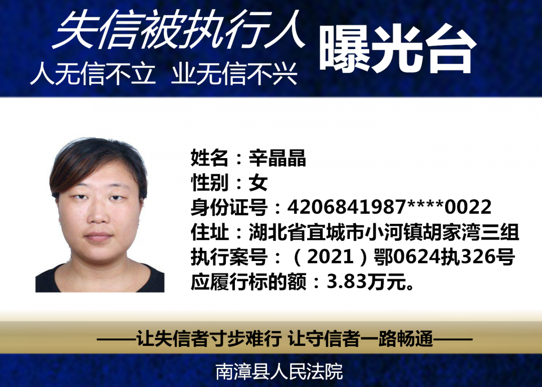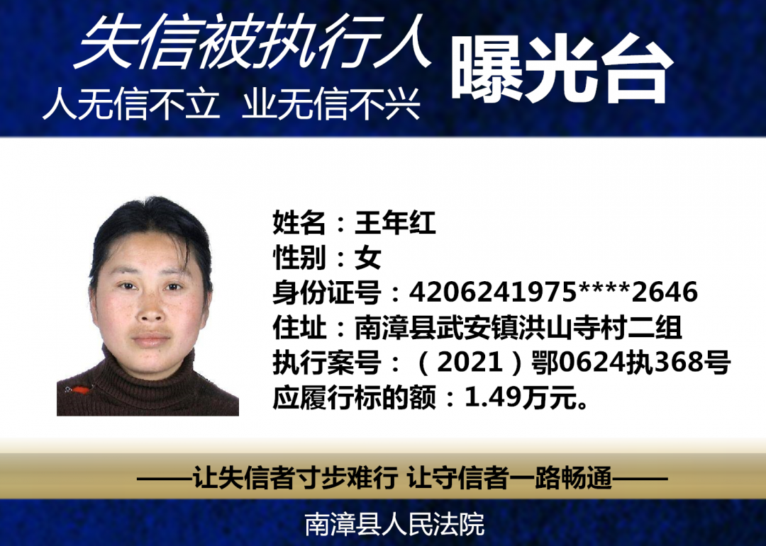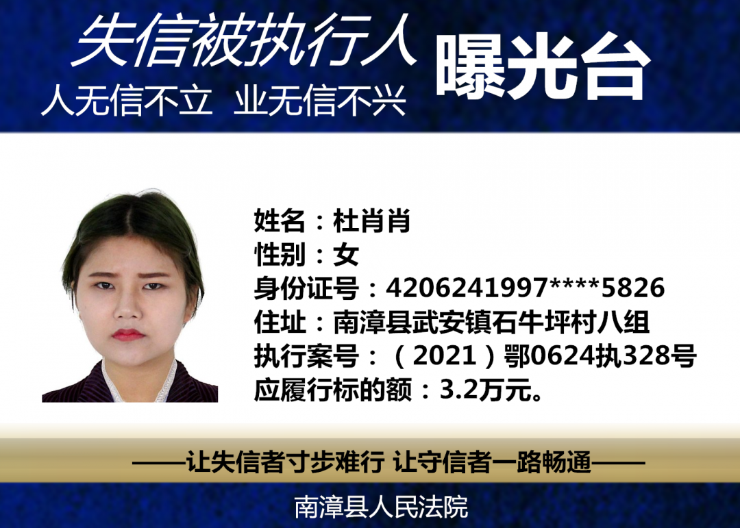 为维护法律的尊严与权威,督促被执行人履行生效法律文书确定的义务,弘扬诚实守信的社会风气,推进诚信社会建设,南漳县人民法院根据《中华人民共和国民事诉讼法》及相关法律规定,决定对下列失信被执行人予以曝光。同时也欢迎广大市民提供失信被执行人的财产线索。☏ 举报热线 0710-5238394