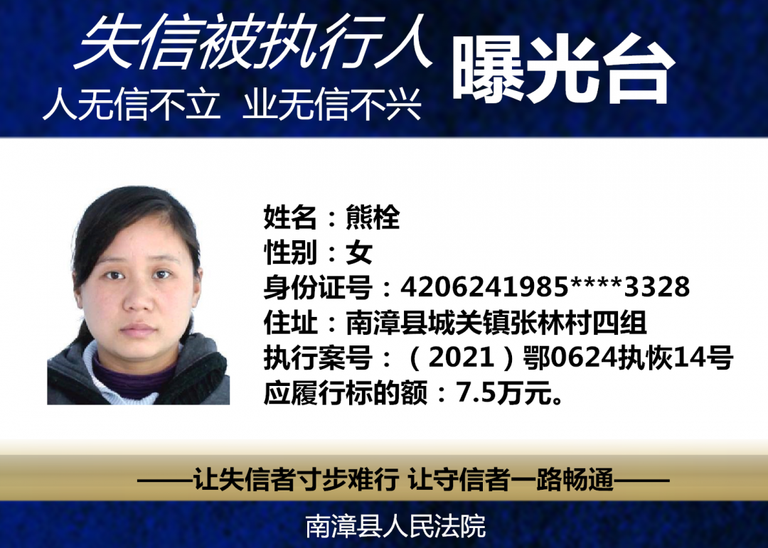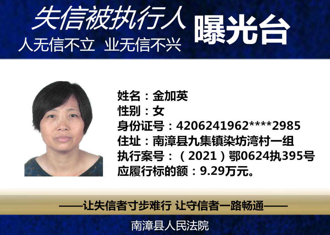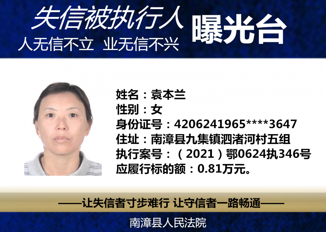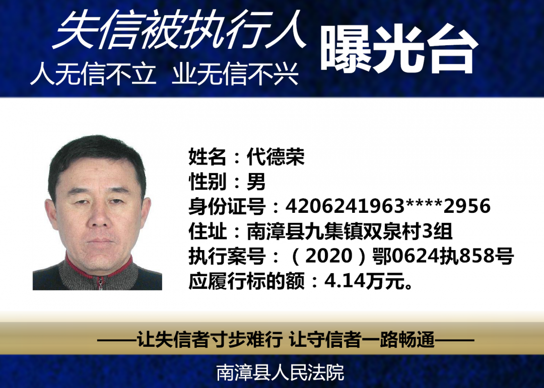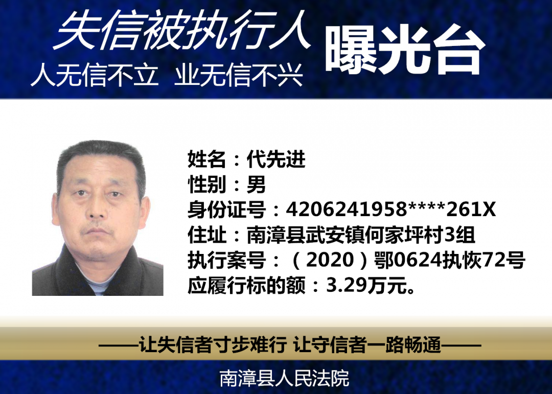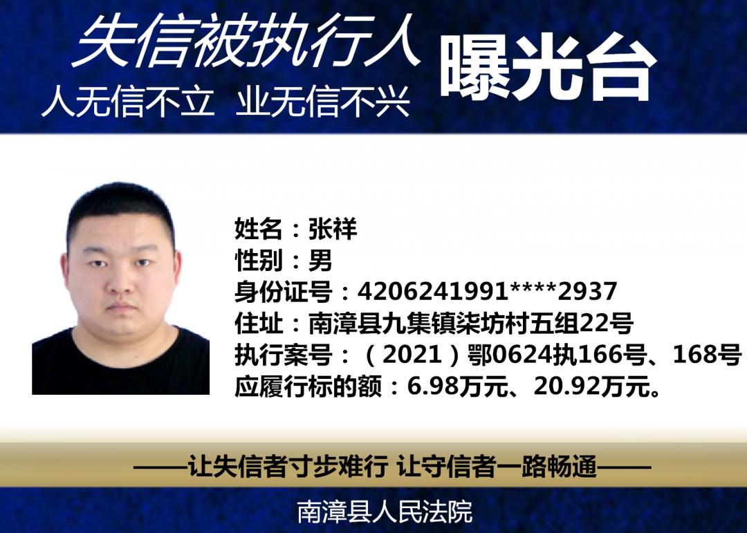 为维护法律的尊严与权威,督促被执行人履行生效法律文书确定的义务,弘扬诚实守信的社会风气,推进诚信社会建设,南漳县人民法院根据《中华人民共和国民事诉讼法》及相关法律规定,决定对下列失信被执行人予以曝光。同时也欢迎广大市民提供失信被执行人的财产线索。☏ 举报热线 0710-5238394