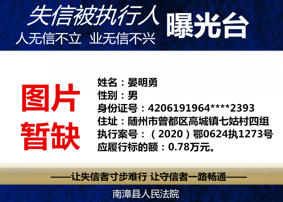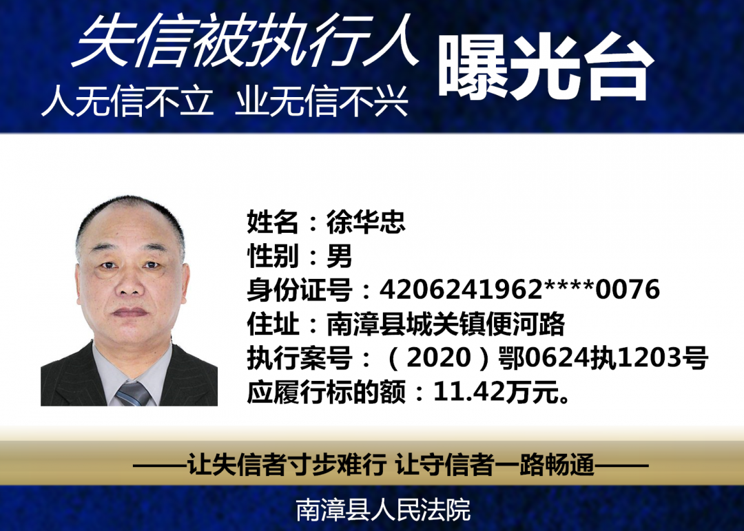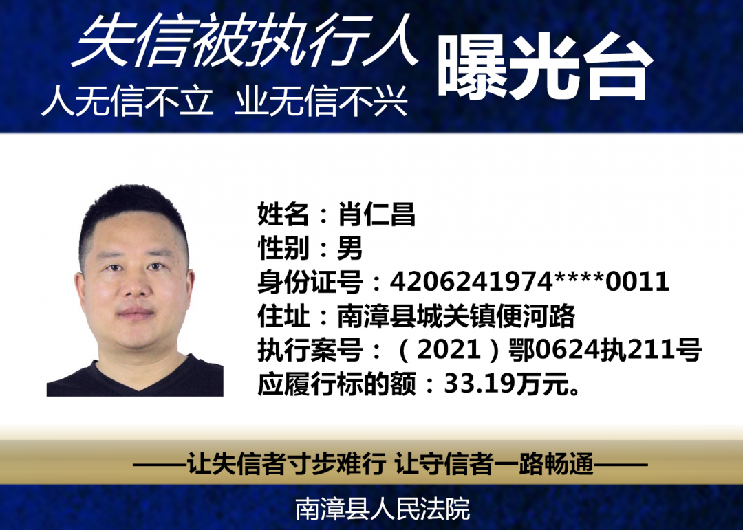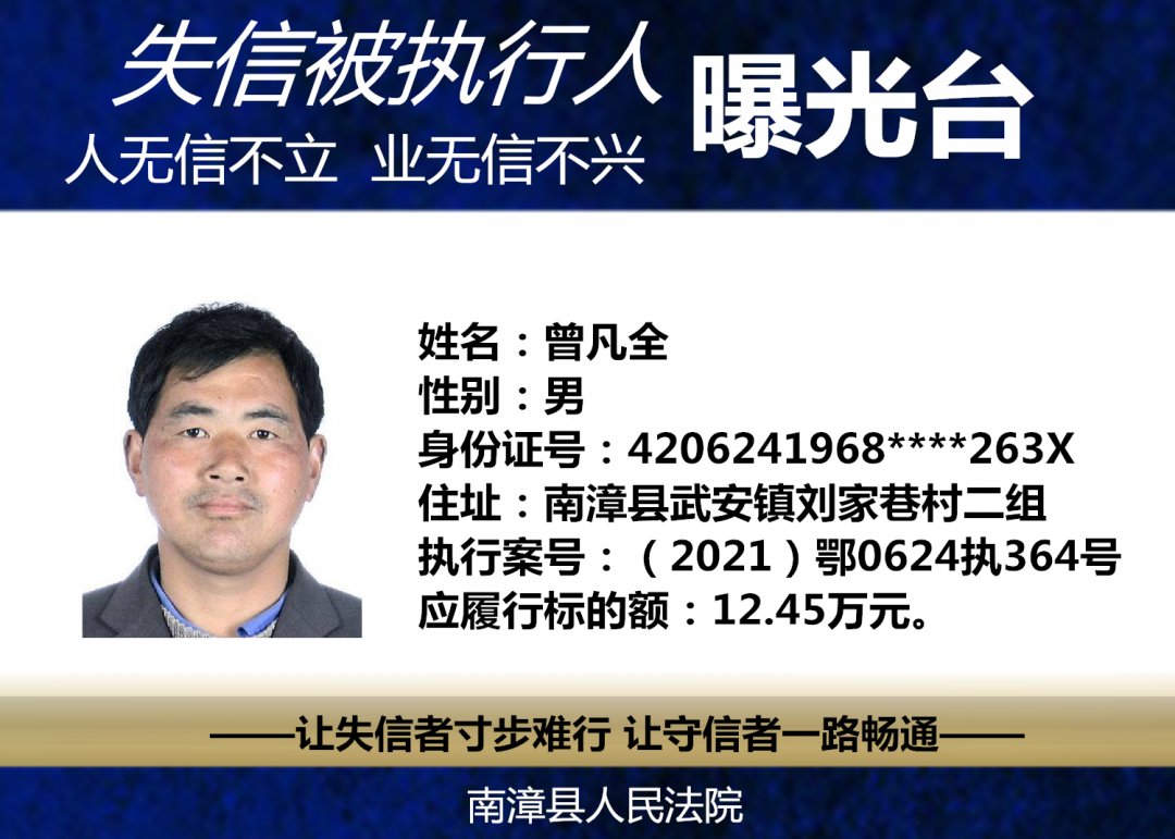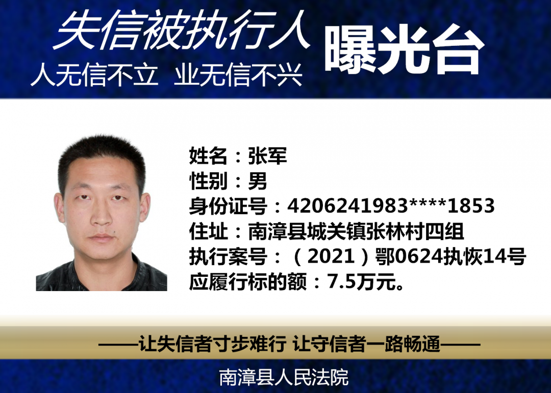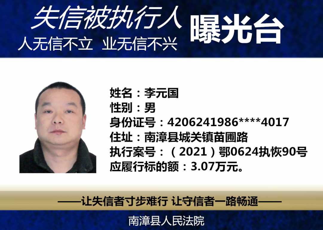 为维护法律的尊严与权威,督促被执行人履行生效法律文书确定的义务,弘扬诚实守信的社会风气,推进诚信社会建设,南漳县人民法院根据《中华人民共和国民事诉讼法》及相关法律规定,决定对下列失信被执行人予以曝光。同时也欢迎广大市民提供失信被执行人的财产线索。☏ 举报热线 0710-5238394