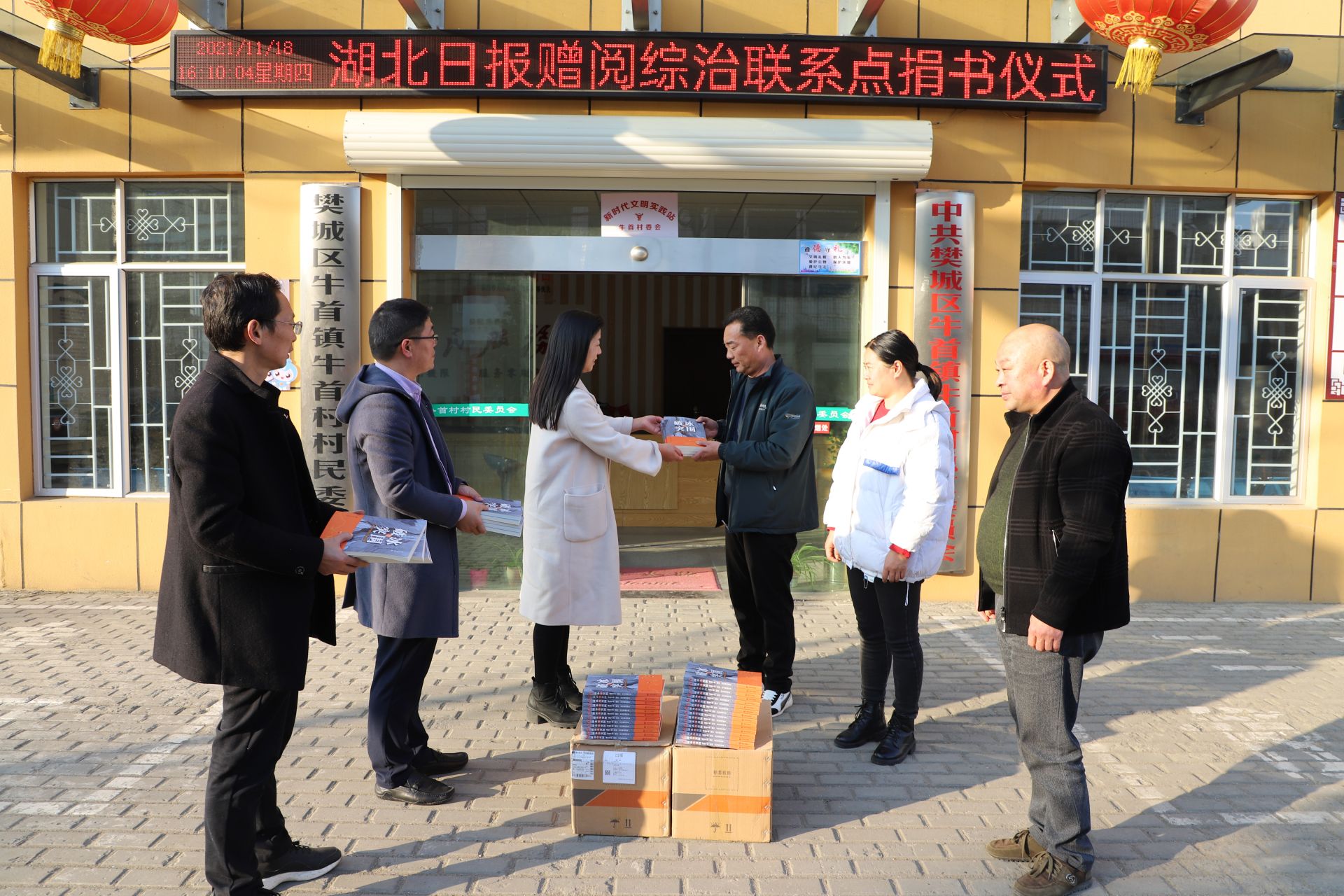 11月18日,湖北日报传媒集团为综治联系点牛首村捐赠图书,樊城区委宣传部副部长樊其燕为樊城区牛首村党总支书记魏福建送去《破冰突围》书籍100本。