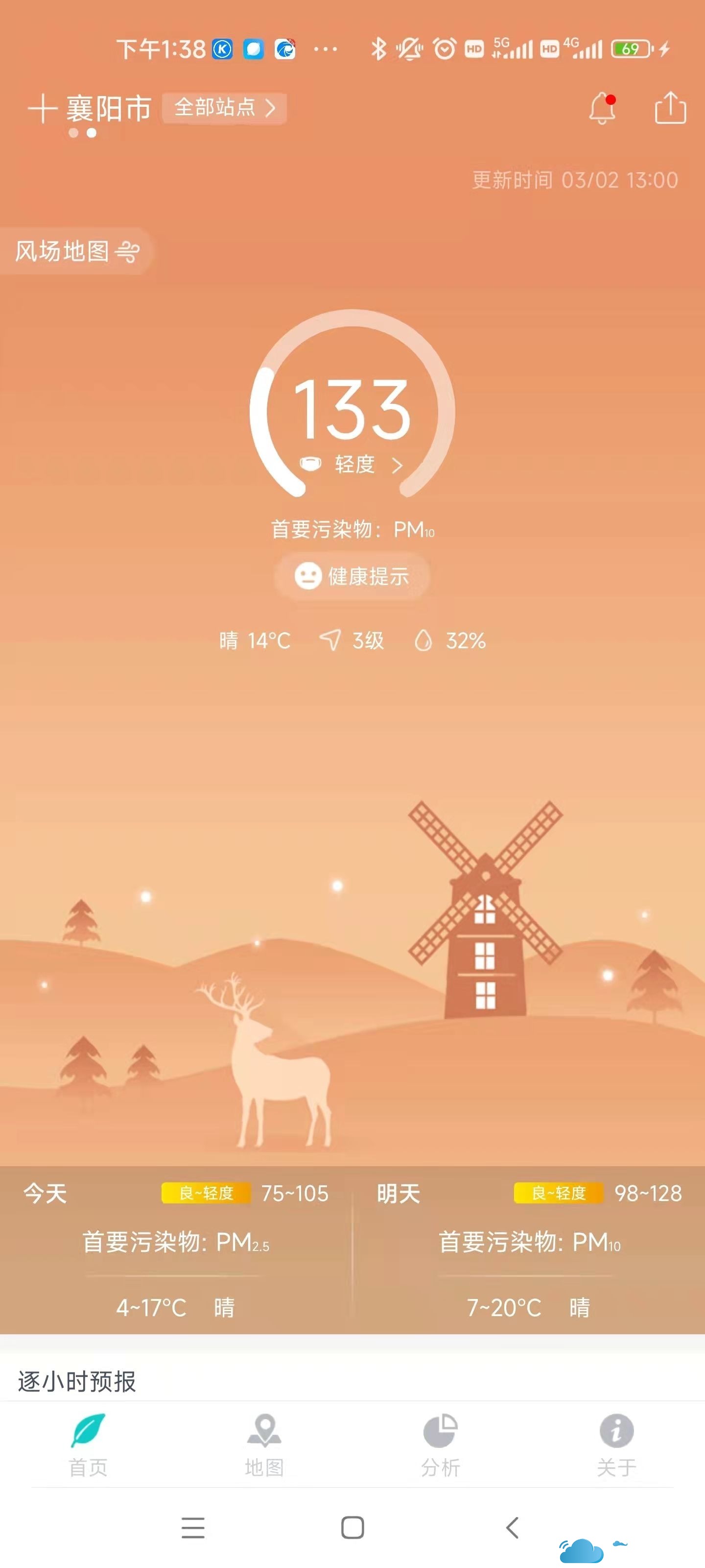 根据监测数据显示,从昨天凌晨开始本市上空就出现了明显的沙尘污染输入,导致昨天本市空气质量迅速变为中度污染。今天本市天气晴间多云,颗粒物浓度逐渐下降,从上午10点开始空气质量已转为轻度污染。