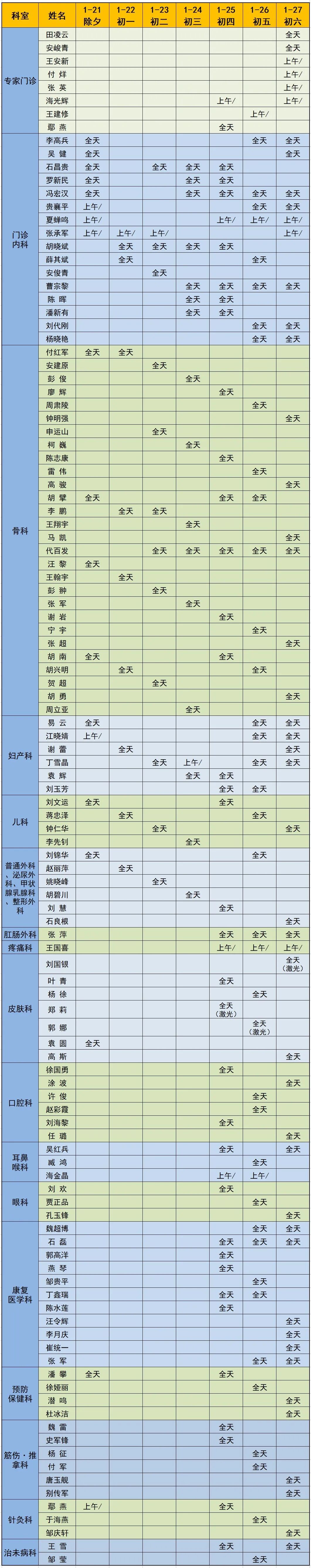 6、门诊部办公室:1月21日—1月24日(年三十至初三)放假,其余时间均安排有人员值班。