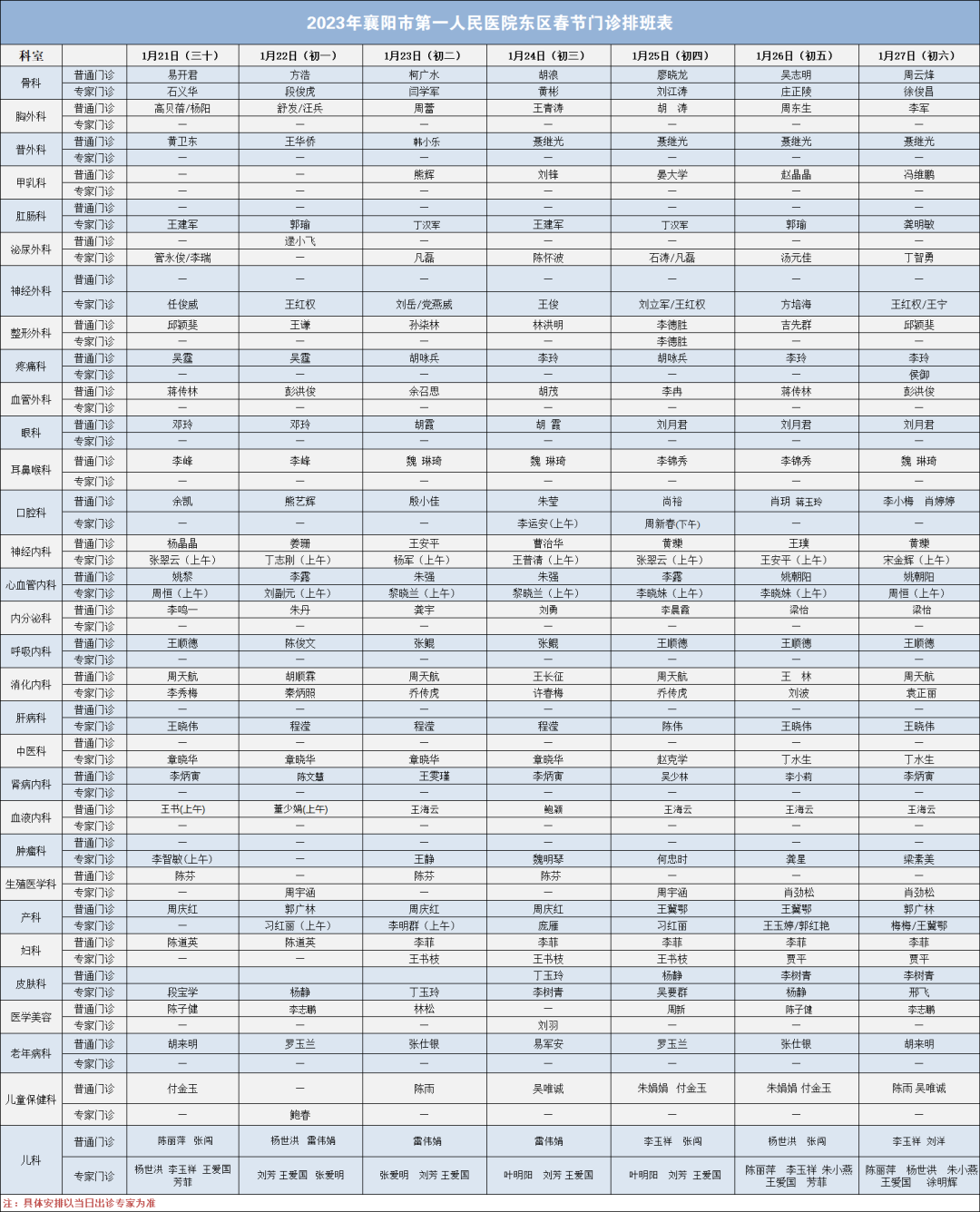 3、专家门诊:2023年1月21日—1月24日(年三十至初三)专家门诊暂停,其余时间均按医院规定坐诊。专家门诊见排班表。
