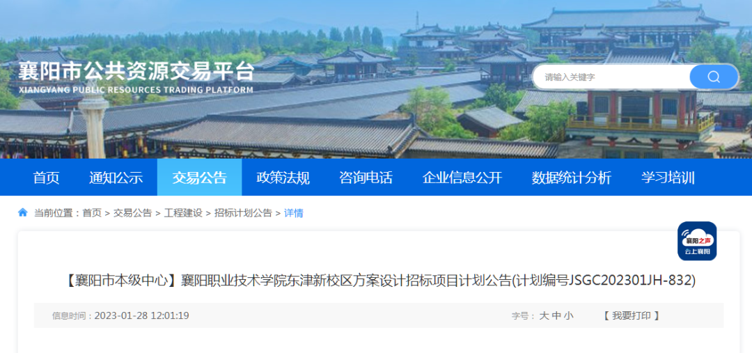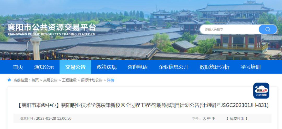 1月28日,襄阳市公共资源交易中心网站发布襄阳职业技术学院东津新校区全过程工程咨询招标项目计划公告,以及襄阳职业技术学院东津新校区方案设计招标项目计划公告。