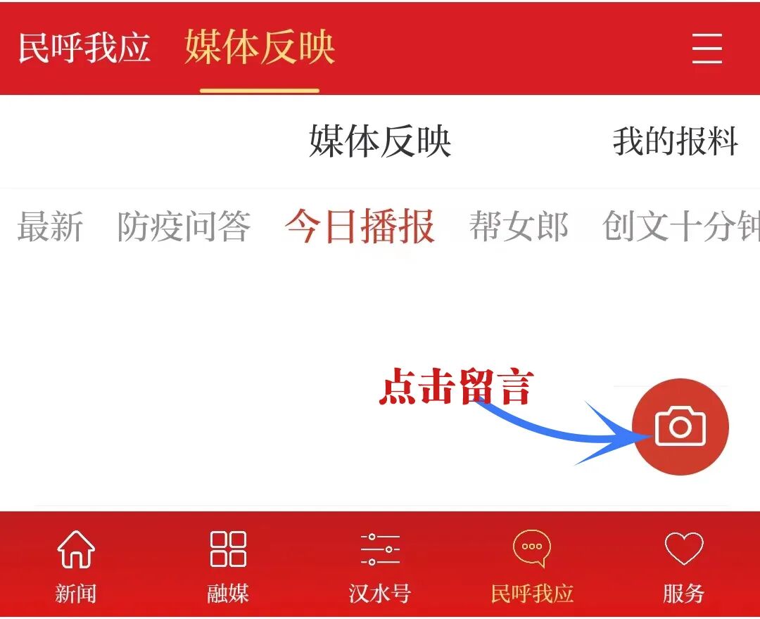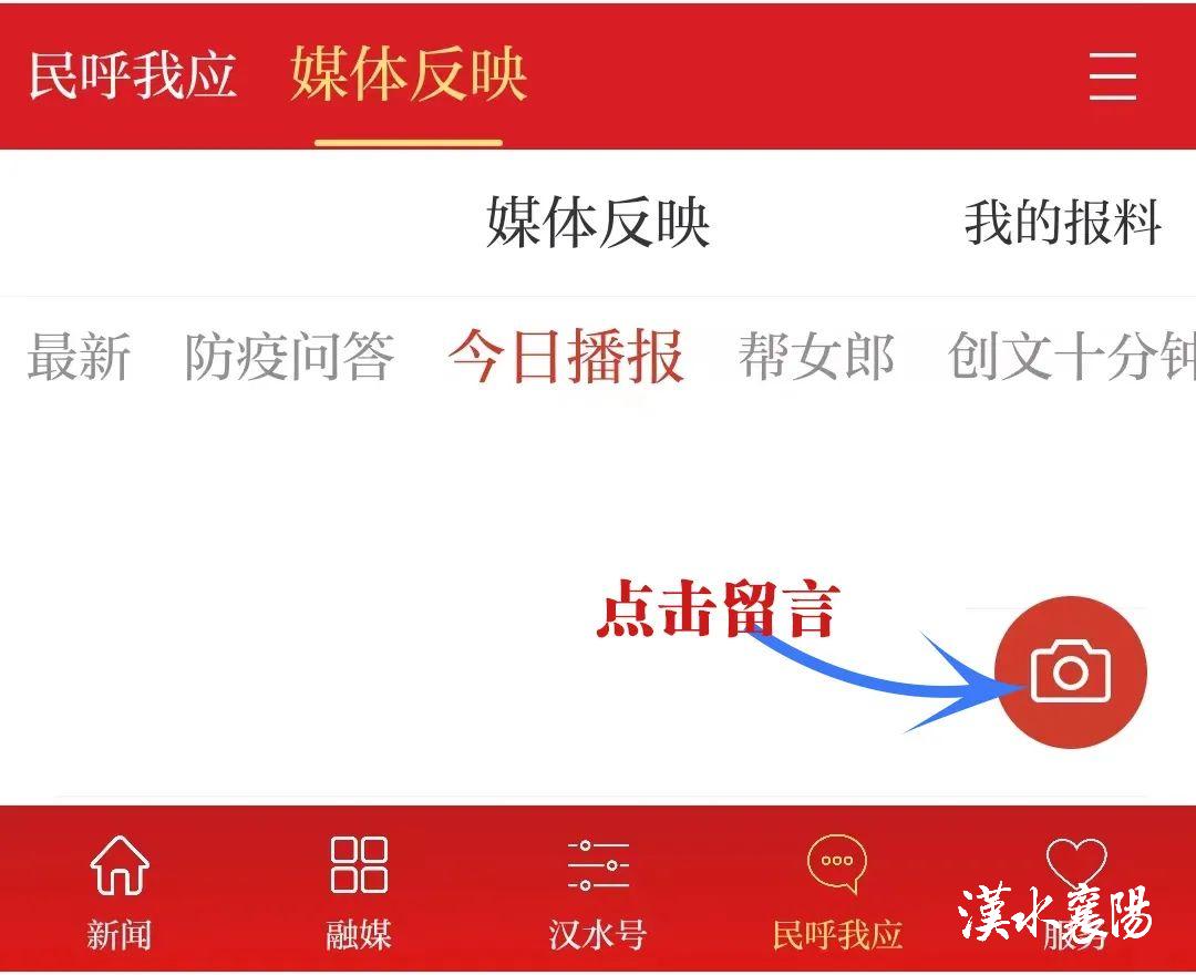 1、汉水襄阳APP“民呼我应”平台打开汉水襄阳APP,点击首页下方的“民呼我应”,进入“媒体反映平台”