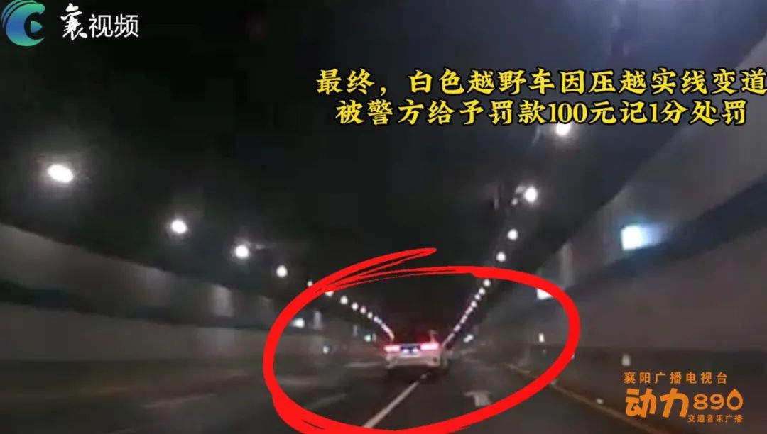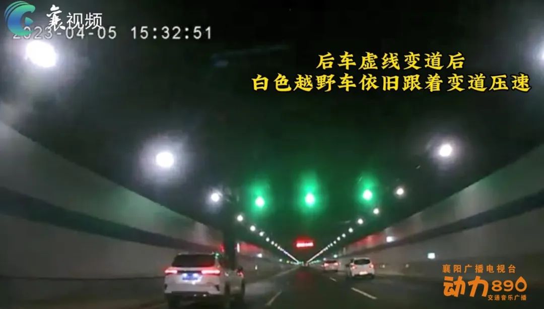 随后,车辆行至隧道内白虚线处,刘先生立刻驾车变换到中间车道,并向白色越野车鸣笛。没想到白色越野车也跟着变道,重新回到刘先生车辆前方。刘先生只得转向最右边车道,而此时白色越野车竟直接越过实线,再次行驶到刘先生车前,继续压低速度行驶,直至两车行至隧道东津段出口才分开。