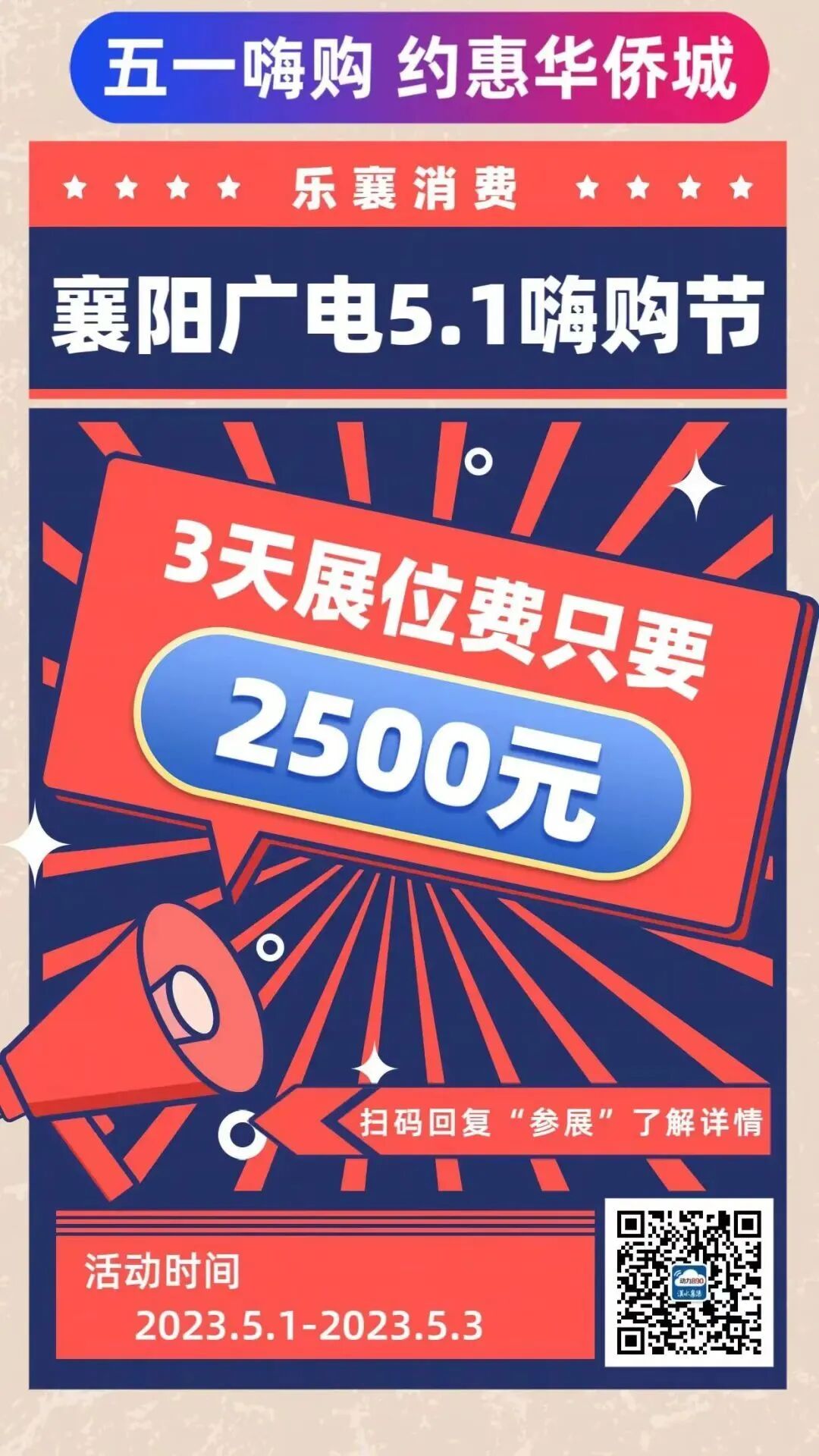 5月1日至3日,襄阳广播电视台将在华侨城庆典广场举办嗨购节,3天展位费只要2500元,全额返还广告。展位有限,先到先得,即日起开始报名!【阅读详情】