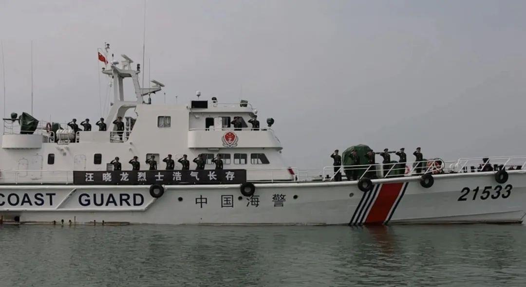 两艘海警舰艇的汽笛声中