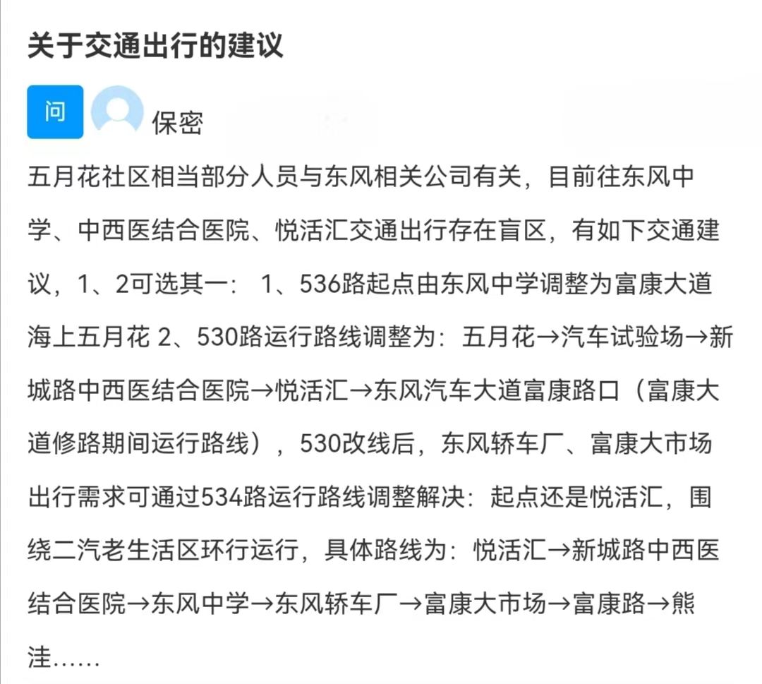 汉水襄阳一名网友在网络问政平台上留言:五月花社区相当一部分人员与东风相关公司有关,目前往东风中学、中西医结合医院、悦活汇交通出行存在盲区,有如下交通建议,1、2可选其一: