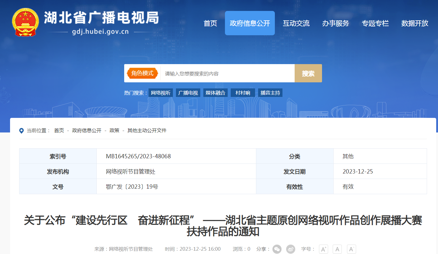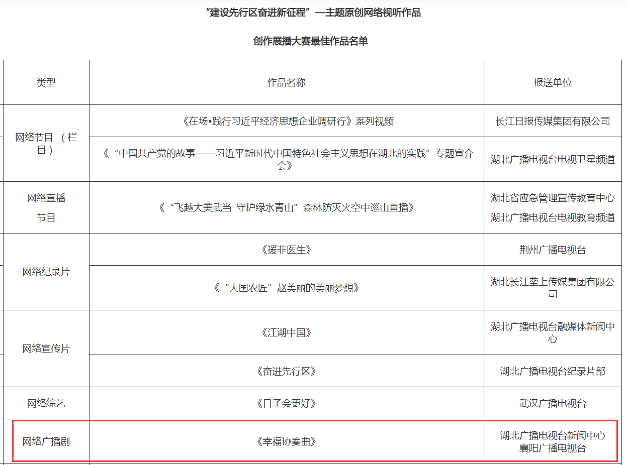 详情请点击:关于公布“建设先行区 奋进新征程” ——湖北省主题原创网络视听作品创作展播大赛扶持作品的通知