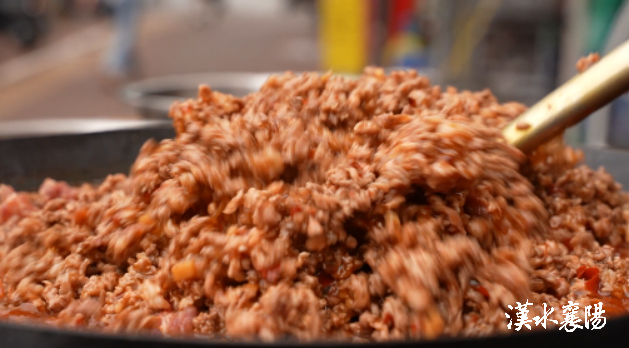 中火不停翻炒,肉末和调料在热油的加持下,逐渐呈现出诱人的微红。再加入几十年的祖传秘方,葱一放,一锅热气腾腾的臊子就出锅了,一切准备就绪,只等夜幕的降临。朴实的粉条搭配鲜香的肉酱,“呲溜”一下,滑入口中,裹挟着一丝丝辛辣,从味觉通透到触觉,拍打、缠绕在舌尖。