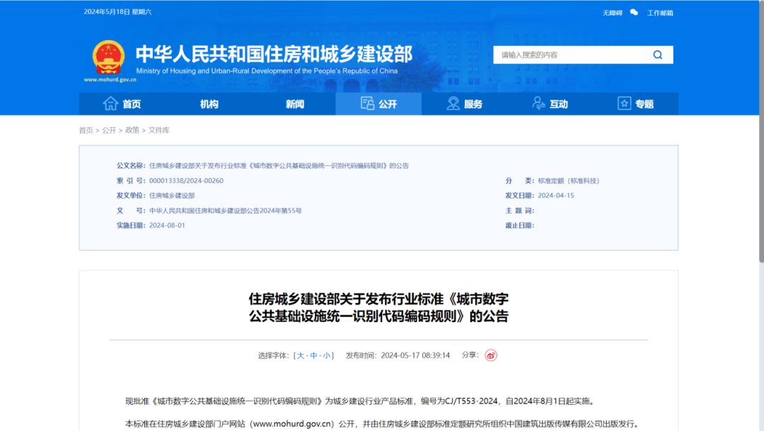 近日,由汉江国投旗下汉江智行科技有限公司(简称汉江智行)参与编制的《城市数字公共基础设施统一识别代码编码规则》(简称《规则》)获住房和城乡建设部批准为城乡建设行业产品标准将于今年8月1日起在全国推广使用。