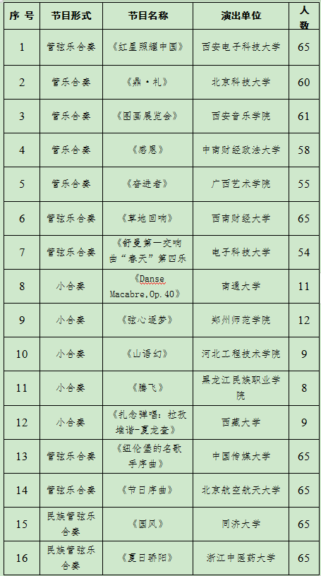 器乐展演现场,将上演众多中外经典名曲。例如,西安音乐学院将演奏苏联著名作曲家穆索尔斯基的《图画展览会》,同济大学将带来由中国著名作曲家赵季平先生创作的民族管弦乐《国风》,重庆大学将演奏为此次大艺节全新创作的《布谷鸟儿咕咕叫》,北京航空航天大学将带来管弦乐合奏《节日序曲》。