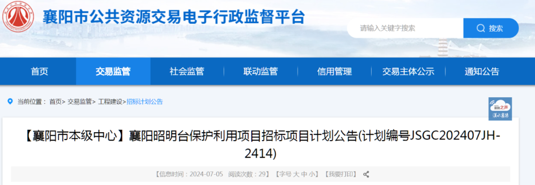 襄阳市公共资源交易网近日发布襄阳昭明台保护利用项目招标项目计划公告。