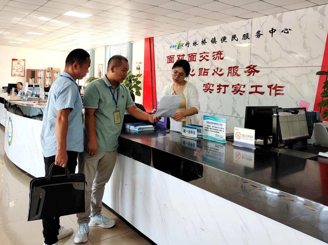 老河口市纪委监委开展基层减负落实情况专项监督,检查是否存在让基层多头报送、重复报送等情况,以强力监督推动基层减负落地见效。图为该市纪检监察干部在竹林桥镇便民服务中心了解减负情况。