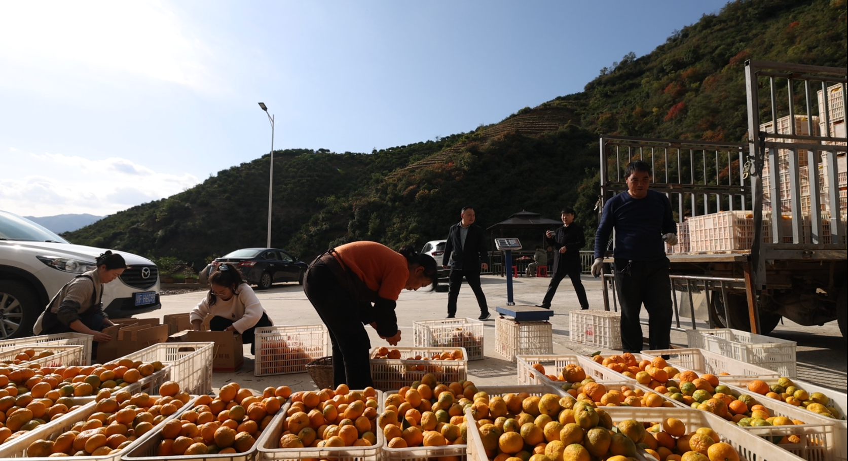 "Our town is surrounded by mountains on three sides, with plenty of sunshine and rainfall, making it perfect for citrus cultivation." said Zhang Sanzhong, Party Secretary of Xiakou Community, while helping farmers connect with merchants. "It's hard to find locals in town now—they're all in the mountains picking fruit. Most people you see here are merchants from elsewhere."