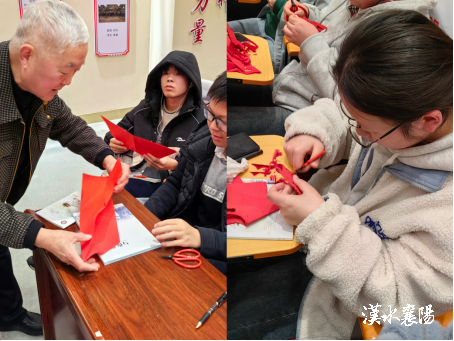 “一剪裁开汉江月,千叠纸浪涌古城”。随后,剪纸非遗传承人移步台前,以现场授课的方式,倾囊相授剪纸这门指尖艺术,开启了一场生动的技艺传承之旅。从纸张的折叠到剪刀的游走,每一个动作都蕴含着千锤百炼的功力。传承人强调,剪纸不仅仅是一种技艺,更是耐心、细心与恒心的融合,是对传统文化敬畏之心的体现。同学们在传承人的指导下,亲手操剪实践。在这一过程中,他们遇到了纸张破裂、图案走样等困难,但在传承人的鼓励下,不断尝试、调整。从简单的几何图形到复杂的蝴蝶造型,同学们逐渐掌握了剪纸的技巧。这不仅是技艺的学习,更是匠心精神的传承。在反复雕琢图案的过程中,同学们体会到了传统手工艺人对完美的执着追求,领悟到在当今快节奏的社会中,这种专注、坚守的精神对于个人成长与社会发展的重要价值,从而在心中种下了坚守与传承的种子。