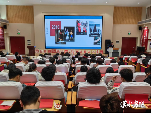 “黑暗传奇襄地启,千秋文脉韵中存”。开场之际,襄阳市非物质文化遗产保护中心主任和琼率先登台,带来《与你襄遇》——“非遗襄阳之我们的非遗”主题讲座,引领众人深入探寻本土非遗的独特魅力。和琼主任集深厚学术素养与丰富实践经验于一身,其在非遗研究领域的诸多成果,为解读襄阳非遗提供了坚实支撑。讲座中,和琼主任从历史的纵轴与文化的横轴出发,剖析襄阳非遗。她指出,襄阳非遗不仅是传统技艺的延续,更是地域文明的活态呈现。以老河口木版年画为例,其独特的雕刻技法与丰富的民俗寓意,是农耕文明时期人们对美好生活向往的视觉化表达,反映了当时社会的价值取向与审美观念。而襄阳剪纸,作为民间艺术的瑰宝,在不同历史阶段不断演变,从最初的祈福辟邪功能,到如今成为传递情感、承载记忆的文化载体,其发展历程与襄阳的社会变迁息息相关。通过对这些非遗项目的解读,同学们领悟到襄阳非遗是地域文化基因的携带者,是民族精神在地方层面的生动彰显,从而深刻理解文化传承对于维系民族认同、增强文化自信的重要意义。
