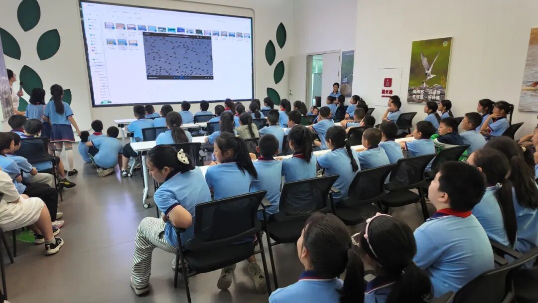 活动现场,孩子们通过体验湿地生态特色课程,在沉浸式互动中解码生物多样性密码。随后,学生们集中观看生物多样性公益宣传片。