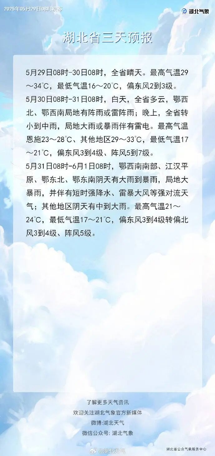明天(30日)白天,全省云层增厚,鄂西有阵雨或雷阵雨。晚上随着新一轮强降雨过程的发展,全省转小到中雨,局地大雨或暴雨伴有雷电。最高气温恩施降至23~28℃,其他地区变幅不大。