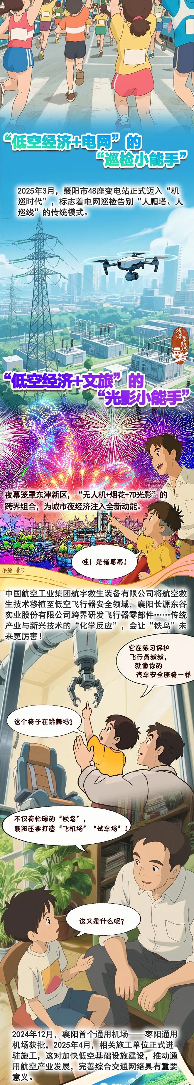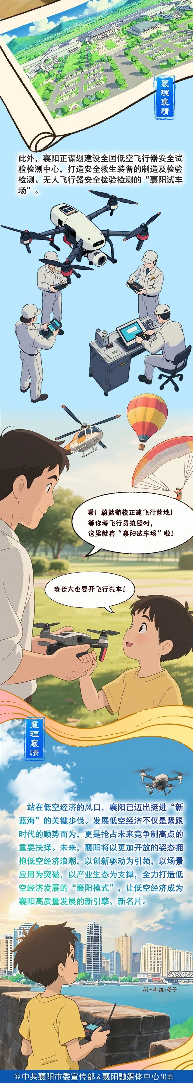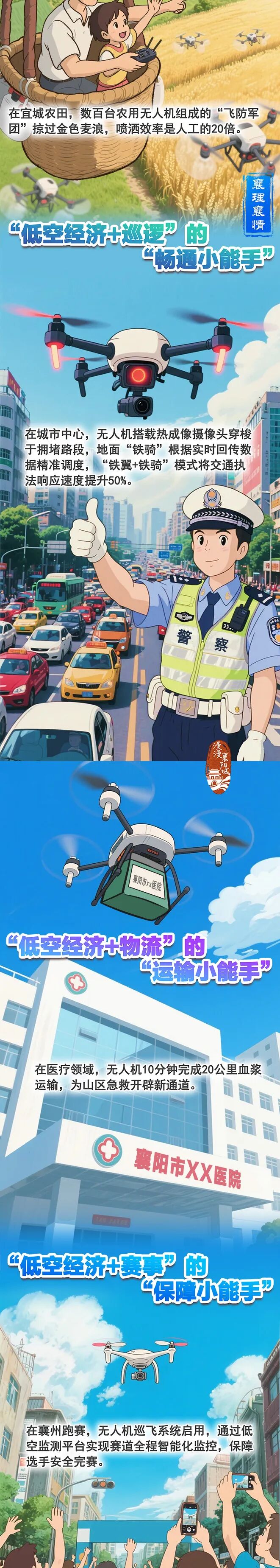 无人机在农田上空作业、光影版“诸葛亮”点亮夜空、城市路况管理有了“铁翼”……这些不是科幻场景,是一道道蔚蓝色的低空航迹,是低空经济在襄阳城市基因中的日常注脚。