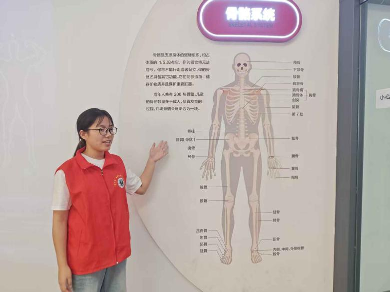 (图为志愿者进行骨骼系统讲解 冯梦欣/摄)