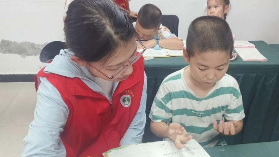 (图为志愿者辅导小朋友课业 胡凤怡/摄)