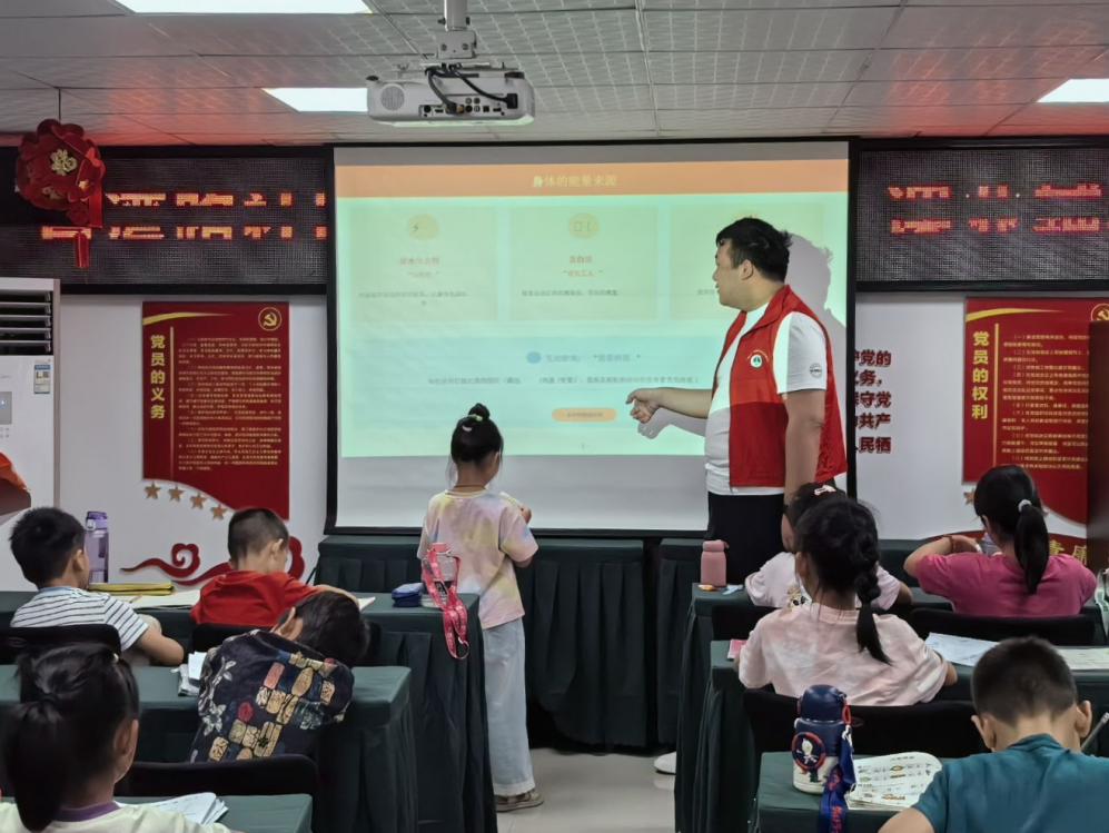 活动伊始,防溺水安全教育率先展开。志愿者深入浅出地向孩子们讲解“六不”避险准则及溺水自救技巧,并且通过互动问答,让孩子们在实践中巩固了暑期安全防线。随后的健康科普智育课堂上,志愿者以“身体里的小秘密”为主题,用童趣语言解锁健康知识。在 “舌尖上的健康” 环节,借助膳食宝塔图讲解食物营养搭配原理;“运动中的活力”板块,通过“运动猜猜猜”游戏让孩子们了解运动科学原理;“睡眠里的魔法”环节,将睡眠比作“身体修复工厂”,分享助眠小妙招,帮助孩子们掌握科学睡眠知识。