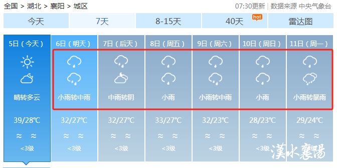 明起襄阳降水增多,局地伴有强对流天气,公众需密切关注临近预报预警信息,外出携带雨具。
