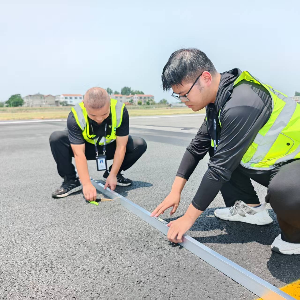 在烈日当空的广阔跑道坪上,场务新人陈萌琦正配合着李坤测量着道面的平整度,握着三米直尺的手心沁出汗水,尺身被烈日晒得发烫。而身为场务分队长的李坤早已习惯了这夏日的跑道。他们全神贯注地检查着每一寸刻度,因为任何微小的裂缝或异物都可能潜藏巨大的安全风险。在完成测量后,他们回到巡场车上,继续沿着既定的巡检路线对道面进行检查。到达跑道掉头坪后,他停下车,走到跑道上仔细观察沥青道面的状况。直到确认一切无误,向塔台汇报跑道适航后,才离开跑道。
