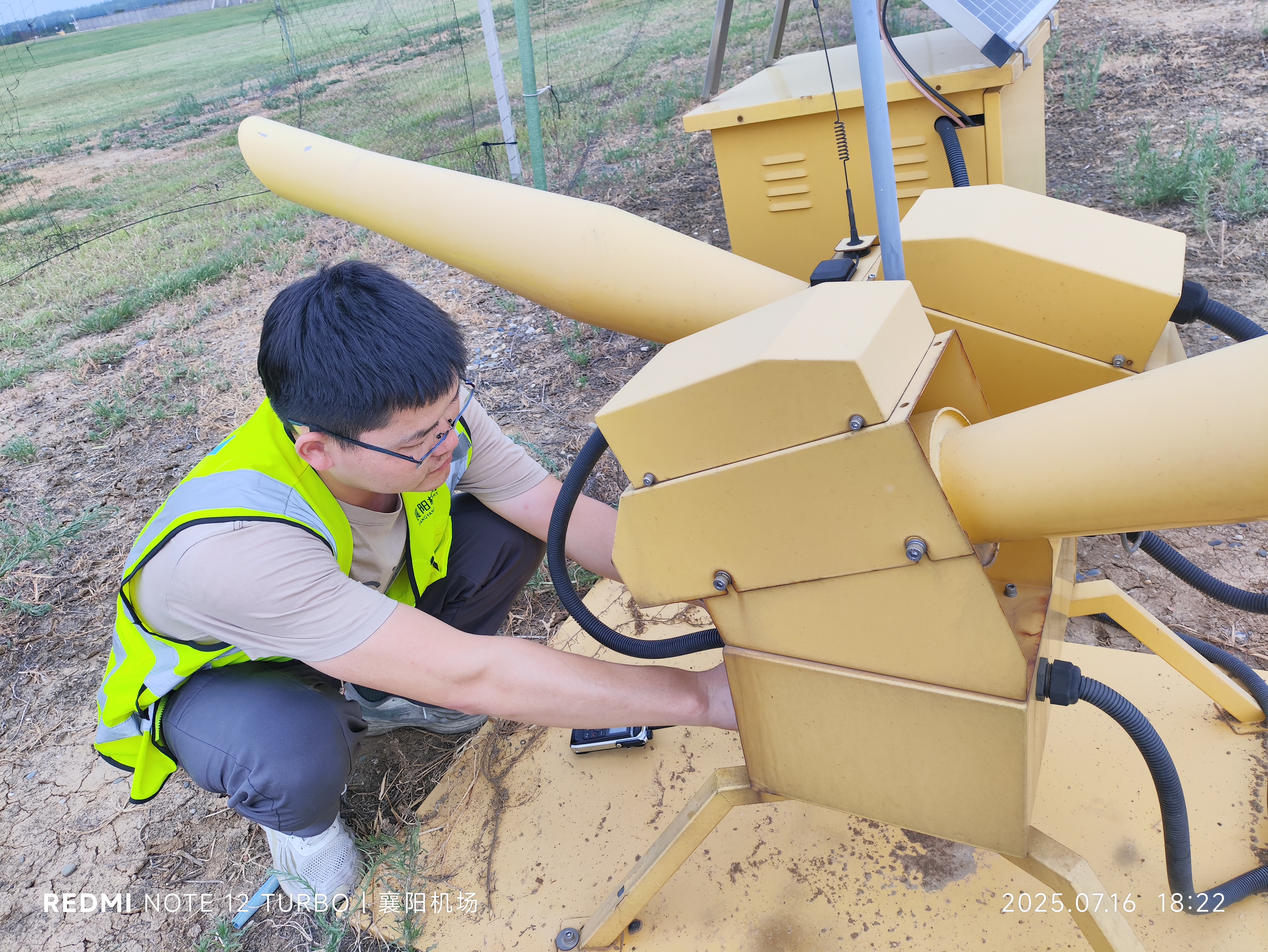 驱鸟员徐家悦携带着驱鸟弹发射器穿梭在跑道两侧,他手中的驱鸟弹发射器发出一声巨响,惊起一群栖息在草地上的麻雀,它们扑棱着翅膀,四散逃离。他抹了一把额头,汗珠顺着晒得发红的脸颊滑落。随即,他快步走向刚才驱赶的区域,调试起驱鸟设备,指尖在发烫的金属外壳上游走,按钮的每一次转动都像是与高温较劲。他回到驱鸟车上,在本子上详细记录着这次驱鸟的时间、地点与鸟群种类,这些数据将成为驱鸟策略优化的密钥,而此刻的跑道已重归寂静,唯有他车顶的警示灯在烈日下微微颤动。