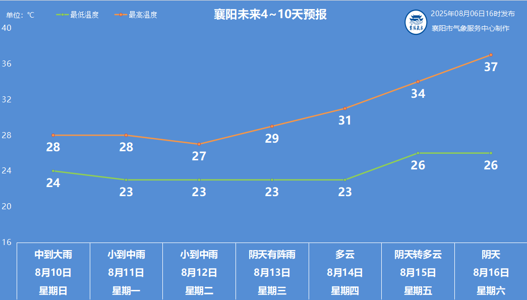 8月9日:多云转中到大雨,偏北风2到3级,气温25到34℃。