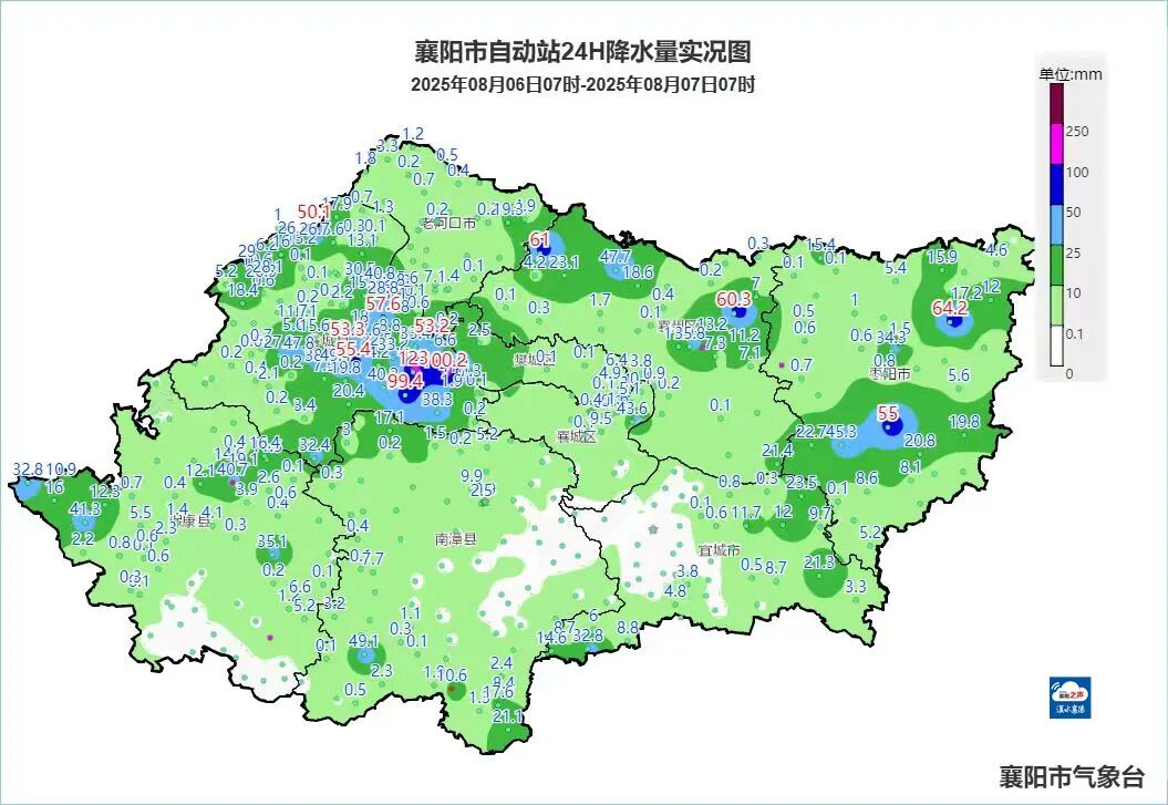 昨天我市有分散性阵雨,局部出现短时强降水,较强降雨位于谷城、襄州、枣阳,全市自动站累计降雨量大于25毫米共40站,其中大于50 毫米共12站,最大降雨出现在谷城庙滩镇八仙洞123 毫米,最大小时雨强97.3 毫米(谷城八仙洞6日15-16时)。