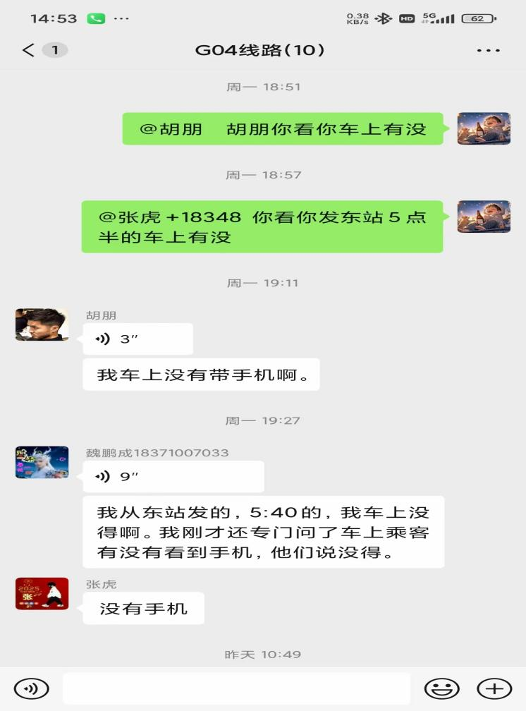抱着试一试的心态,和先生向正在待发的樊智航师傅求助。樊师傅在了解详细情况后,没有丝毫犹豫,立刻在工作群里询问同事车上是否有遗失的手机。与此同时,他凭借丰富的经验,通过发班时间精准倒推出和先生乘坐的车辆。