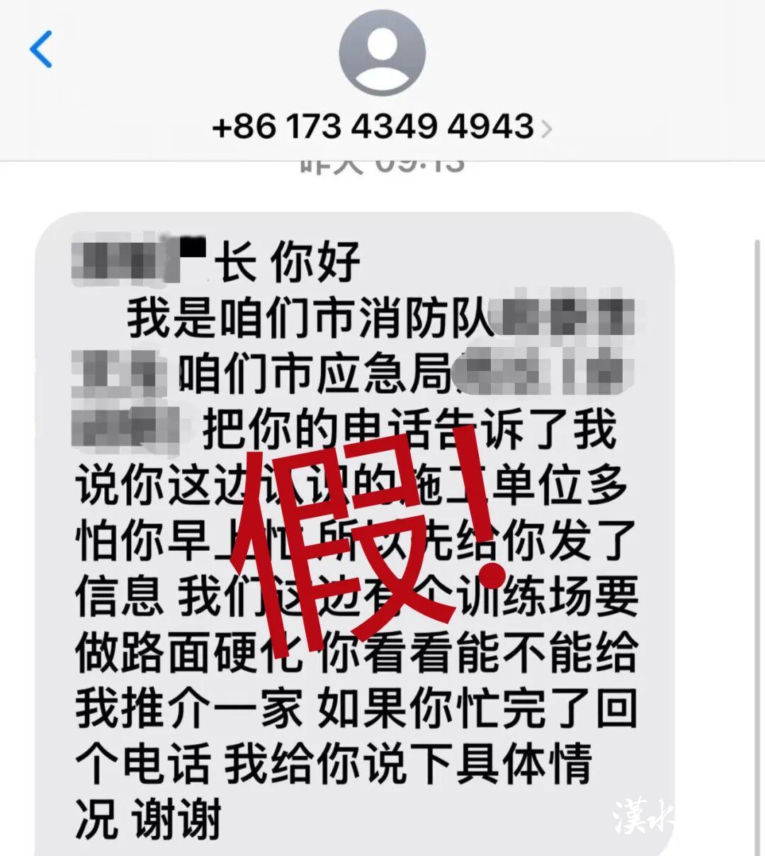近日,湖北省十堰市消防救援支队接到社会单位反映称,有不法分子打着消防支队工作人员的旗号,群发短信给单位相关公职人员,谎称消防队有工程需要帮忙介绍施工方,严重破坏了消防救援队伍赴汤蹈火、服务人民的社会形象。