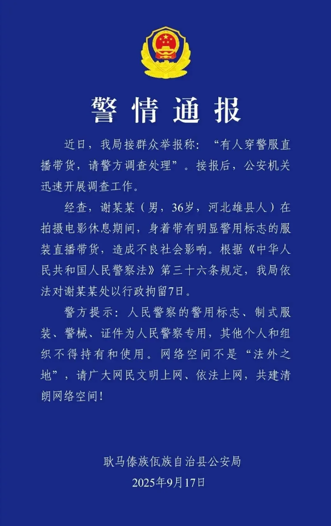 ■ 演员“嘎子哥”谢某某在9月10日的网络直播中穿警服带货并骂人一事持续引发关注。9月17日,云南临沧市耿马傣族佤族自治县公安局发布警情通报,经查,谢某某(男,36岁,河北雄县人)在拍摄电影休息期间,身着带有明显警用标志的服装直播带货,造成不良社会影响。根据《中华人民共和国人民警察法》第三十六条规定,依法对谢某某处以行政拘留7日。9月18日,记者查询发现,“嘎子哥”快手账号已被封禁。