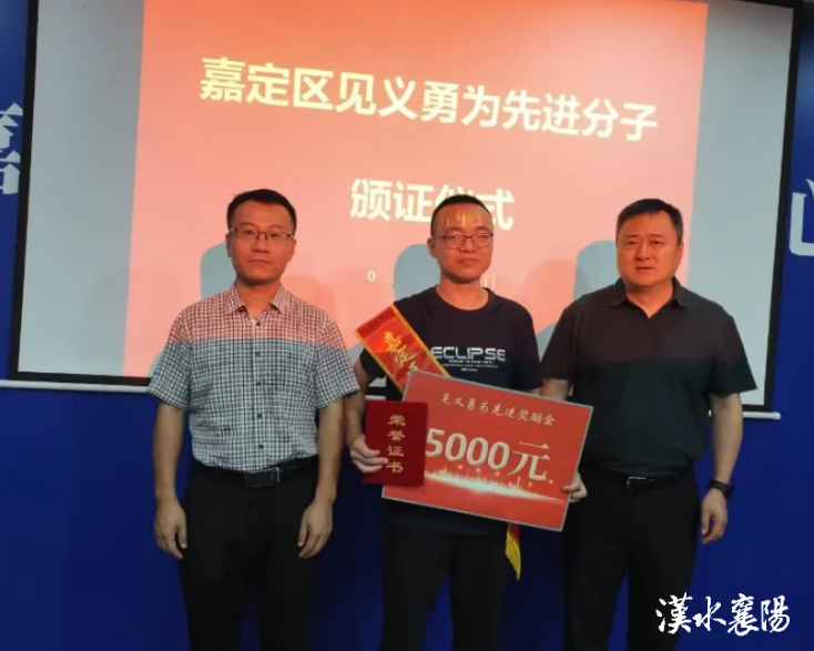 ■ 10月11日上午,上海市嘉定区为来自襄阳的务工人员邵飞举行颁证仪式,正式授予邵飞“嘉定区见义勇为先进分子”荣誉称号,并奖励5000元,以此表彰他在数月前勇救跳河轻生女子的英勇善举。【阅读详情】