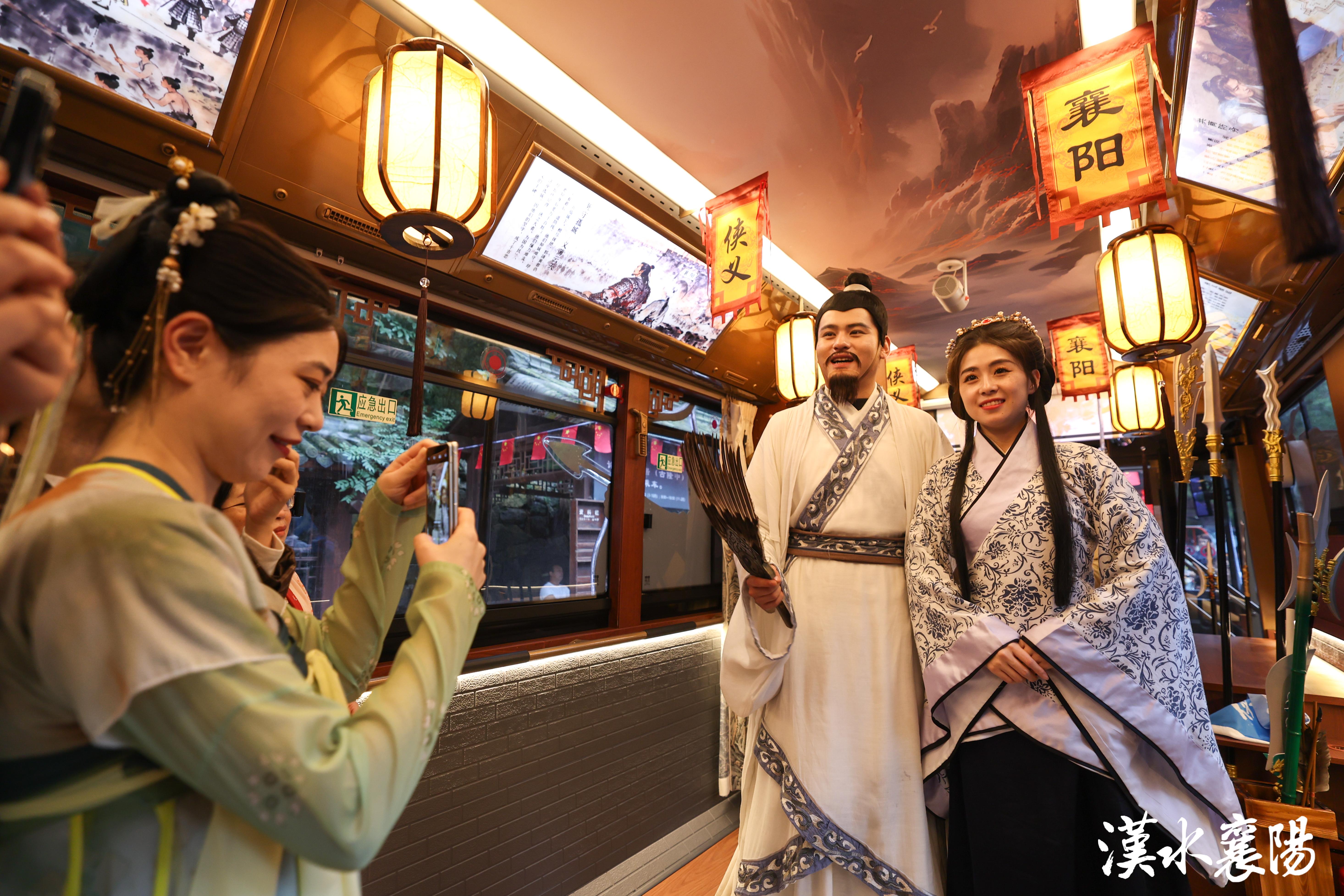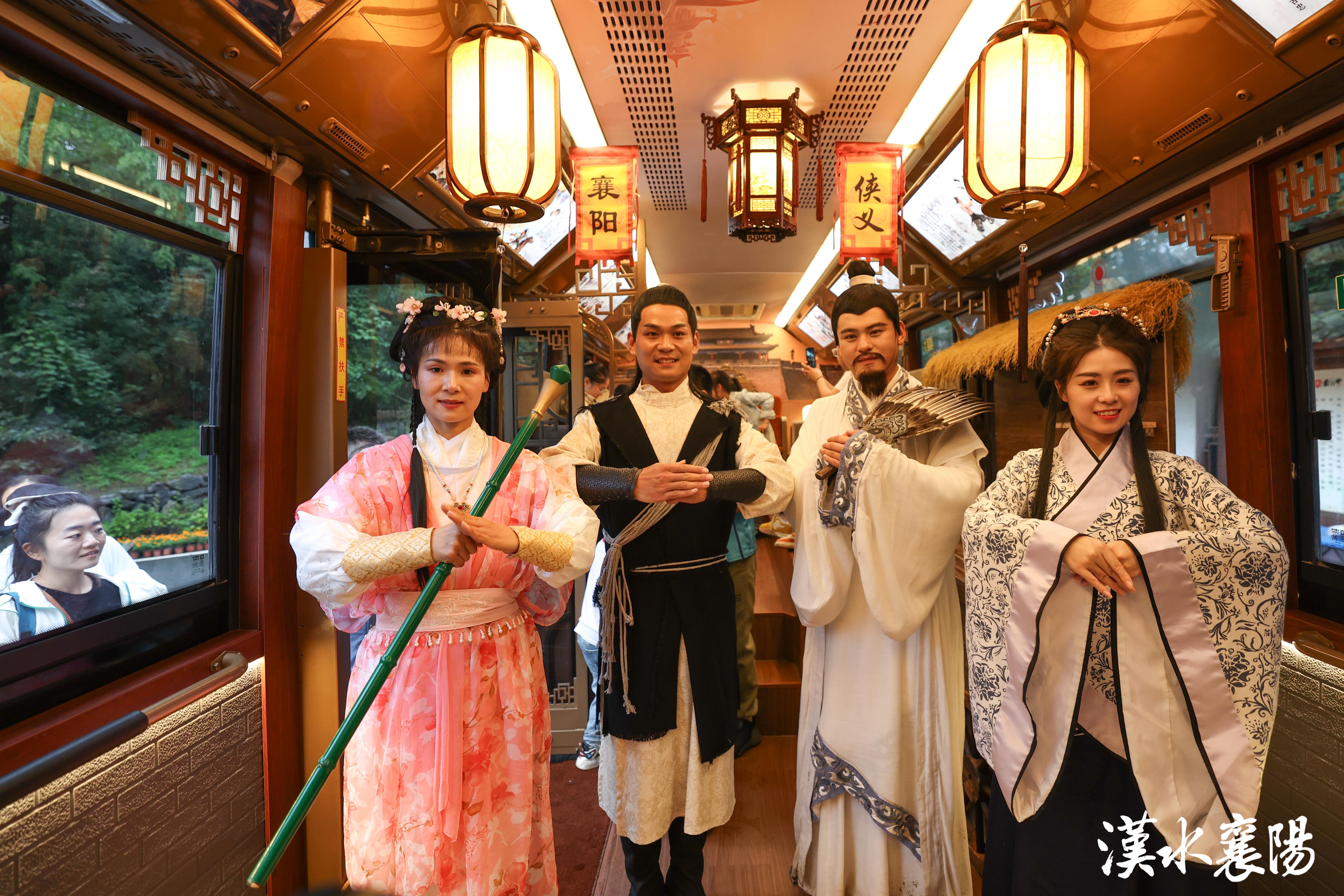 当全国首辆"侠义主题"公交的驶入襄阳古城,当即成为最火爆的文旅亮点。车身绘着郭靖、黄蓉的动漫形象,车厢内花灯高悬、战鼓陈列,打狗棒等仿古兵器与雕花木窗相映成趣,仿佛一座移动的武侠剧场。