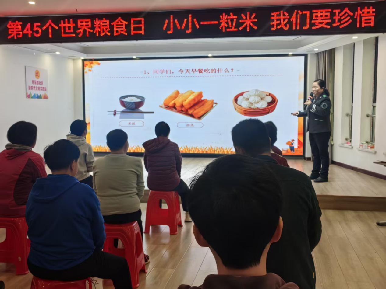 在“粮食的重要性”板块,志愿者指出印有“空空餐盘”和“满满米饭”的对比图:“大家看,要是我们像上次吃点心那样剩下食物,碗里就会变成这样空空的,会发生什么呀?”孩子们立刻摇头喊“不行,会饿”,志愿者笑着竖起大拇指:“对呀,所以我们要像珍惜每次见面的时光一样,珍惜每一粒粮食!”