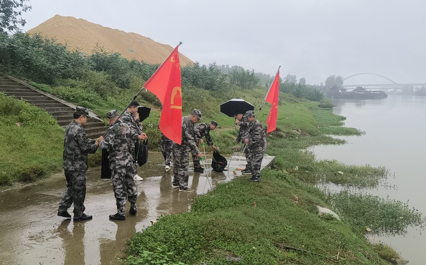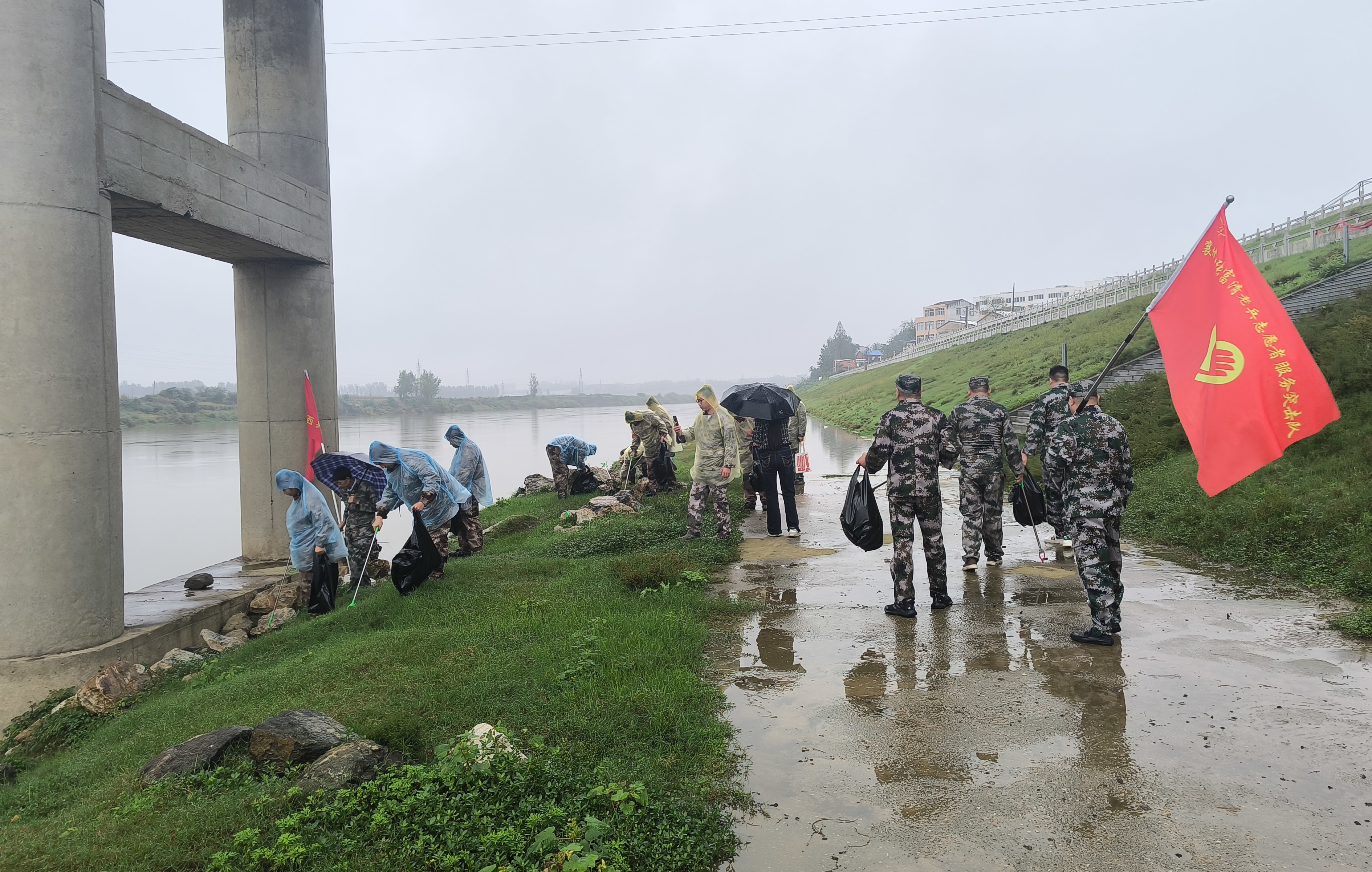 10月17日,襄州区关爱退役军人协会组织襄州区张富清老兵志愿服务队、襄州区退役军人“长江卫士”志愿服务队、襄阳西典心理咨询服务中心部分师生,冒雨在双沟镇唐河段开展“长江卫士 金秋护河”活动,以实际行动守护家乡河湖健康。