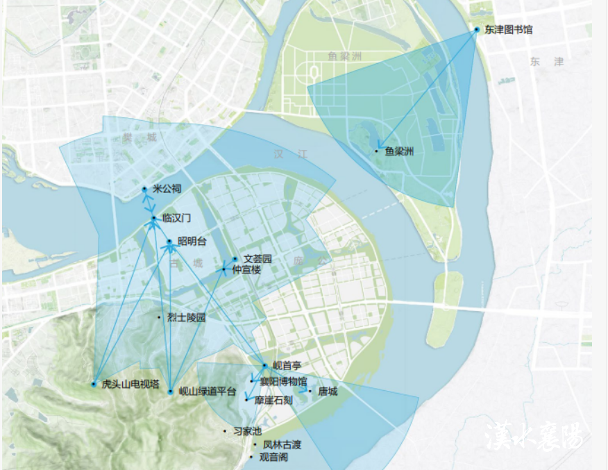 五路看城则根据观赏岘山与古城的优美山城江州,形成最美的观城第一眼,选取了5个交通视廊,包含卧龙大桥、长虹大桥、汉江一桥、凤雏大桥和东津大桥。