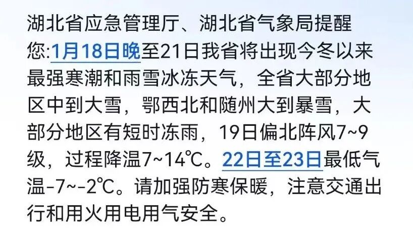 预计今天全省阴天到多云,东部和南部有霾,北部最高气温下滑至8~14℃,南部维持在15~20℃。明天白天鄂东北东部、鄂东南以多云到阴天为主,其他地区有小雨飘洒,明天夜间至21日,受强冷空气影响,我省将出现今冬以来最强寒潮和雨雪冰冻天气,相态将由雨转为雨夹雪、冻雨、冰粒和纯雪,最强时段为19日,全省大部地区将出现中到大雪,十堰、神农架、襄阳、随州将出现大到暴雪。