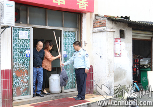 王先锋督促收捡挂在门外的拖把。 记者 白菲斐 摄