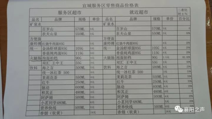 对照9月28号市物价局通报的宜城服务区零售商品价格表,记者注意到,通报的17个商品,除了香烟和百岁山矿泉水价格跟就近超市持平外,其他商品价格均超过了20%。