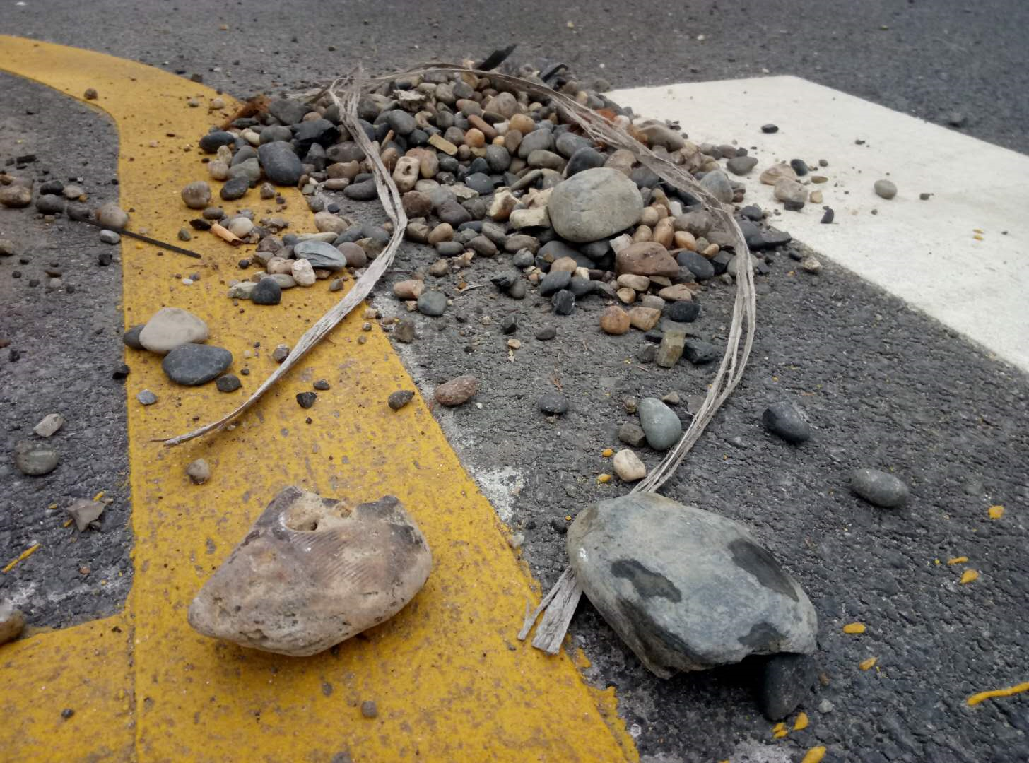 曹先生说,这个交叉口是新修的道路,刚通车不久,上周大货车还比较少,到了本周,满载的大货车越来越多。在白天,大货车还收敛点。到了晚上,不仅多拉快跑,车上的沙石料也不遮盖,洒漏的石子到处飞,最大的石子有成人拳头大小。担心石子被车碾轧后,飞出砸伤行人和其它车辆,当地一位老人不定时过来清理,然而前面刚清完,货车又洒漏出来。