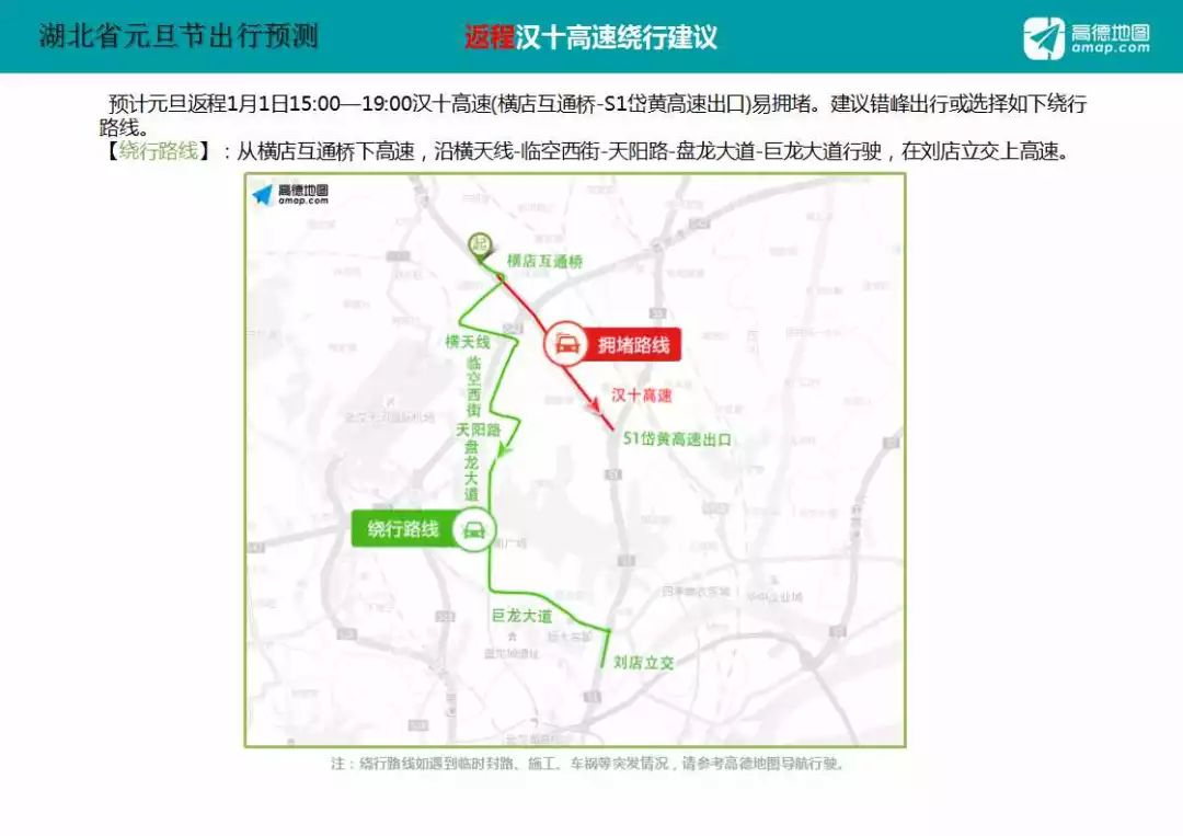 预计元旦返程1月1日15:00—19:00汉十高速(横店互通桥-S1岱黄高速出口)易拥堵。建议错峰出行或选择如下绕行路线。